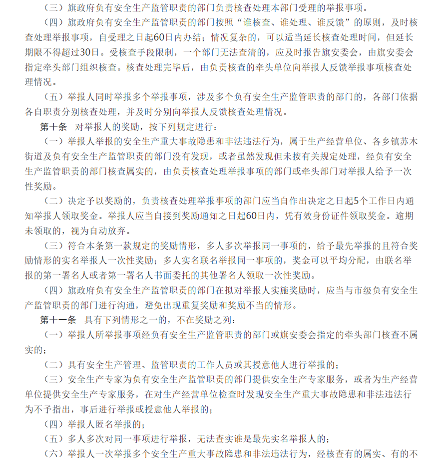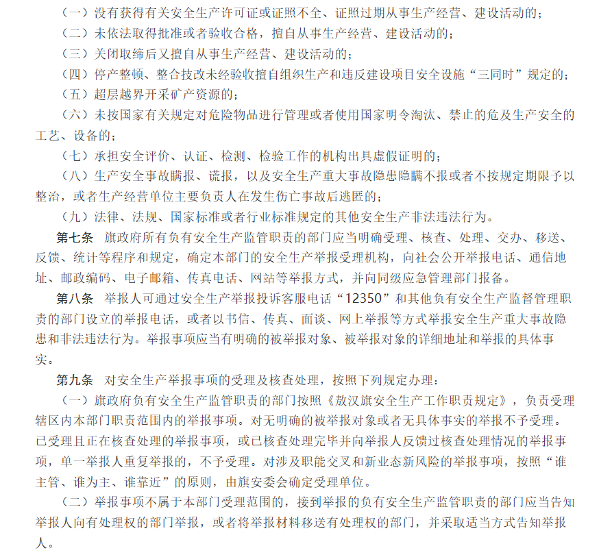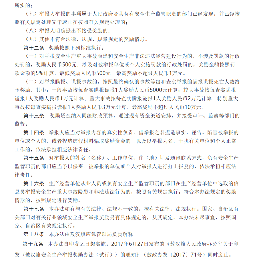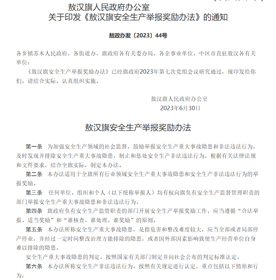 敖汉旗人民政府办公室关于印发《敖汉旗安全生产举报奖励办法》的通知