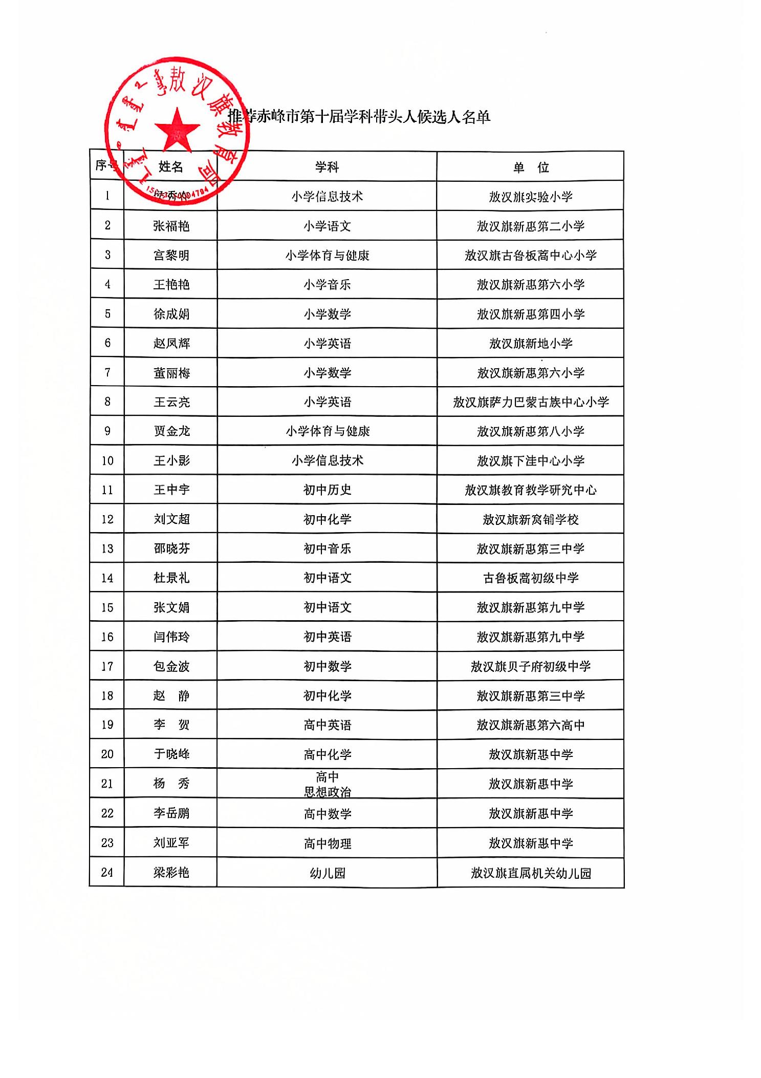 敖汉旗教育局关于赤峰市第十届学科带头人拟确定人选名单公示
