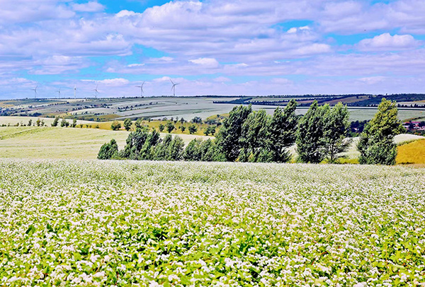 敖汉旗黄羊洼镇牛力皋川被荞麦花染白的田野。