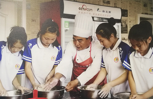 李树发(中)手把手教授青少年学习荞面条制作技艺,让敖汉拨面文化在新时代焕发新生。