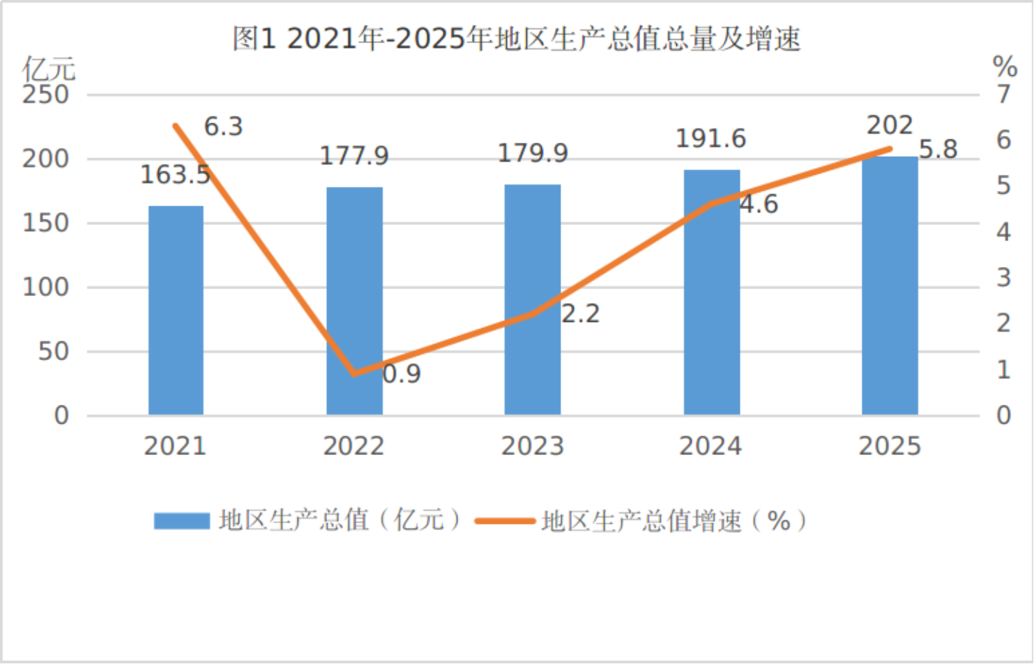 根据盟市生产总值统一核算结果,2025年全旗地区生产总值完成202亿元、增速5.8%。其中,第一产业增加值74亿元、增长5.1%;第二产业增加值36亿元、增长6.6%;第三产业增加值92亿元、增长6%。三次产业结构比例为:37:18:45。按不变价计算,全年地区生产总值176.4亿元,其中,第一产业增加值63.5亿元;第二产业增加值30.4亿元;第三产业增加值82.5亿元。