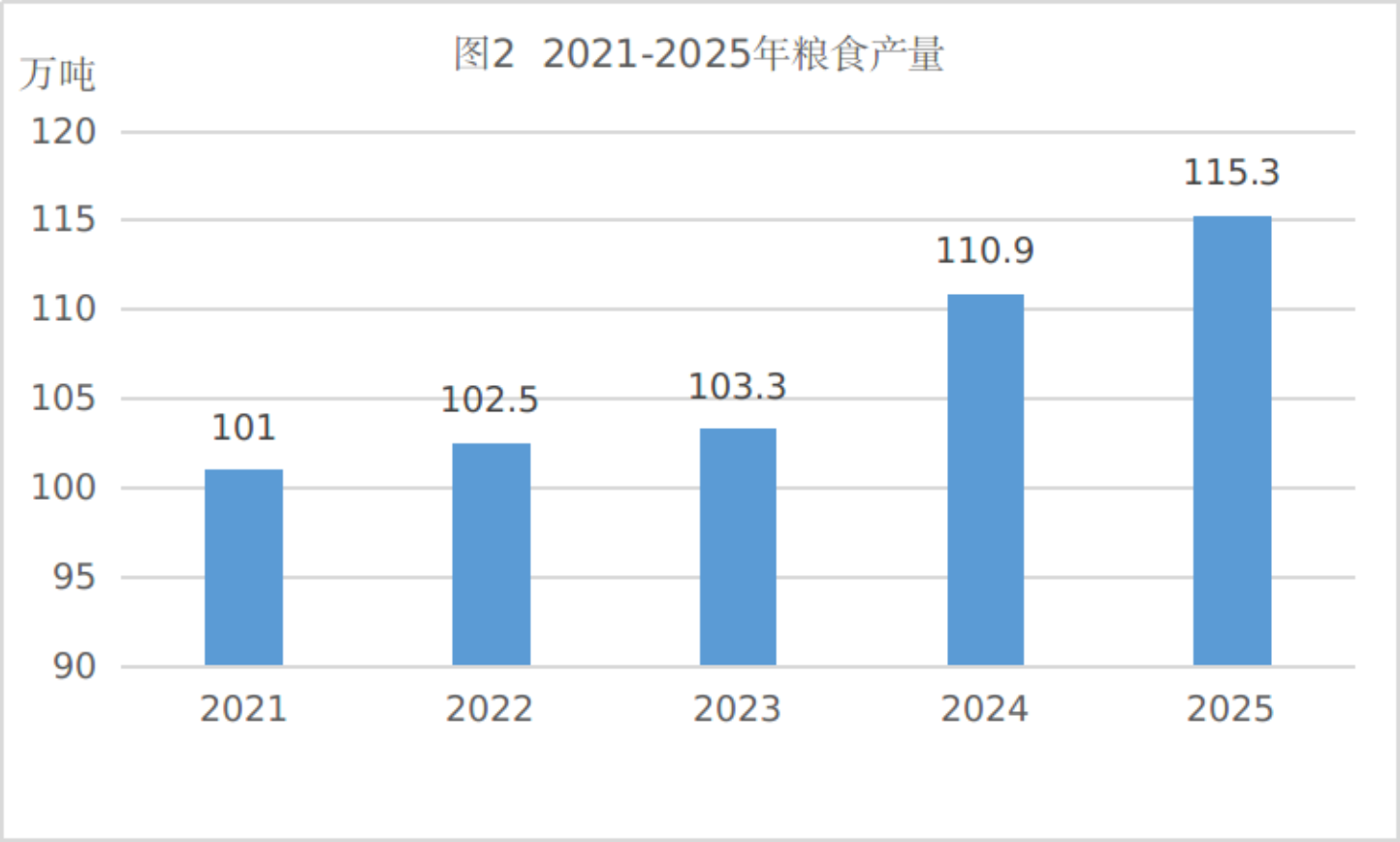 2025年,全旗农作物总播种面积20.1万公顷,同比增长1.2%。其中,粮食作物播种面积19.1万公顷,同比增长0.5%;经济作物播种面积1万公顷,同比增长16.8%。粮食总产量115.3万吨,同比增长4%,其中稻谷0.67万吨、玉米81万吨,谷子20.5万吨。经济作物中,油料产量1万吨,甜菜产量1.3万吨,蔬菜及食用菌产量13.2万吨,瓜果产量2.9万吨。