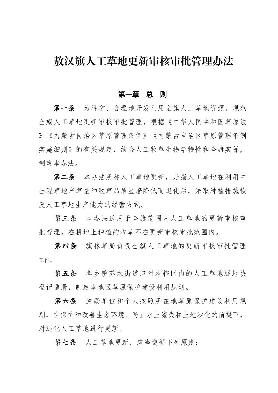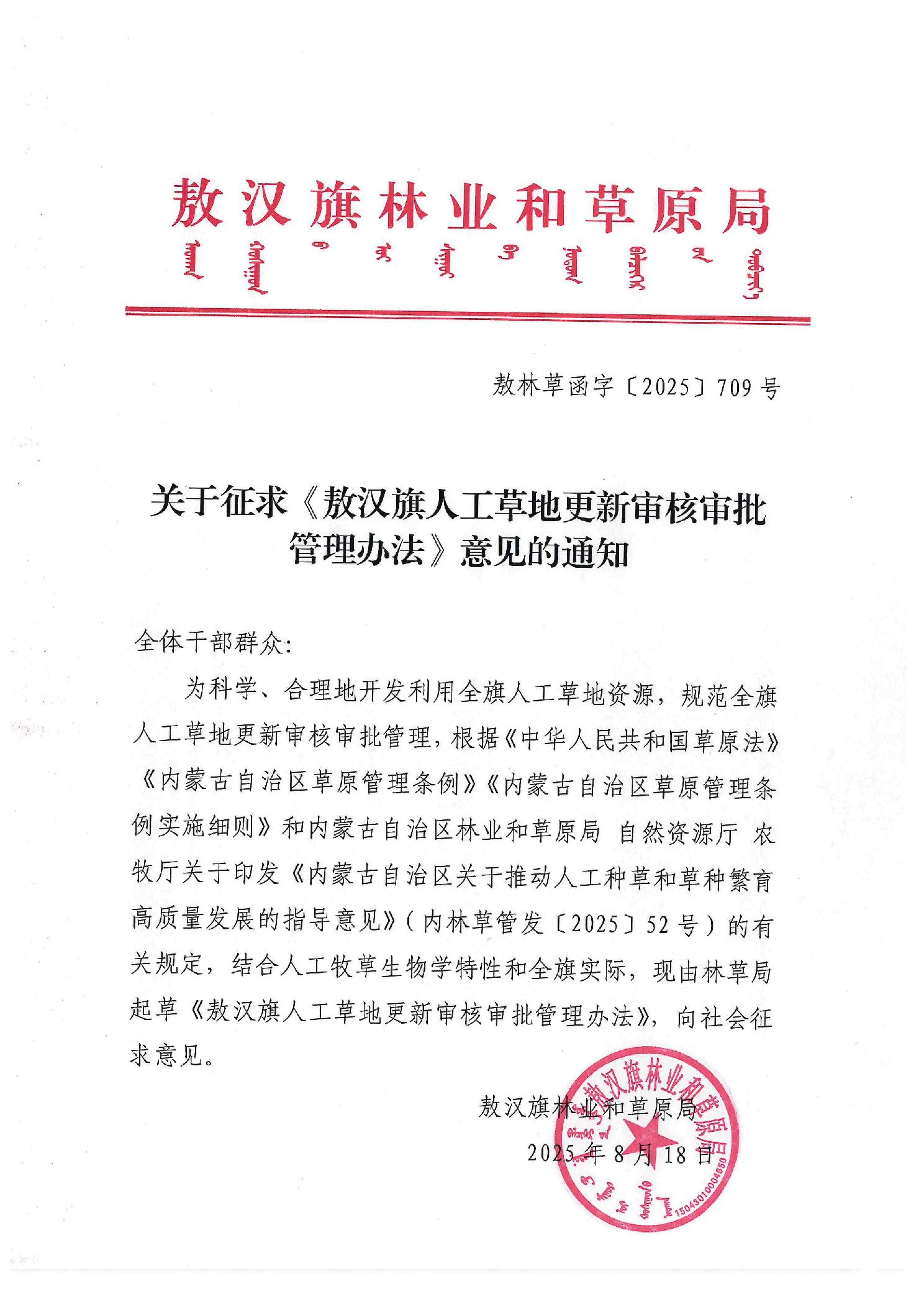 关于征求《敖汉旗人工草地更新审核审批管理办法》意见的通知