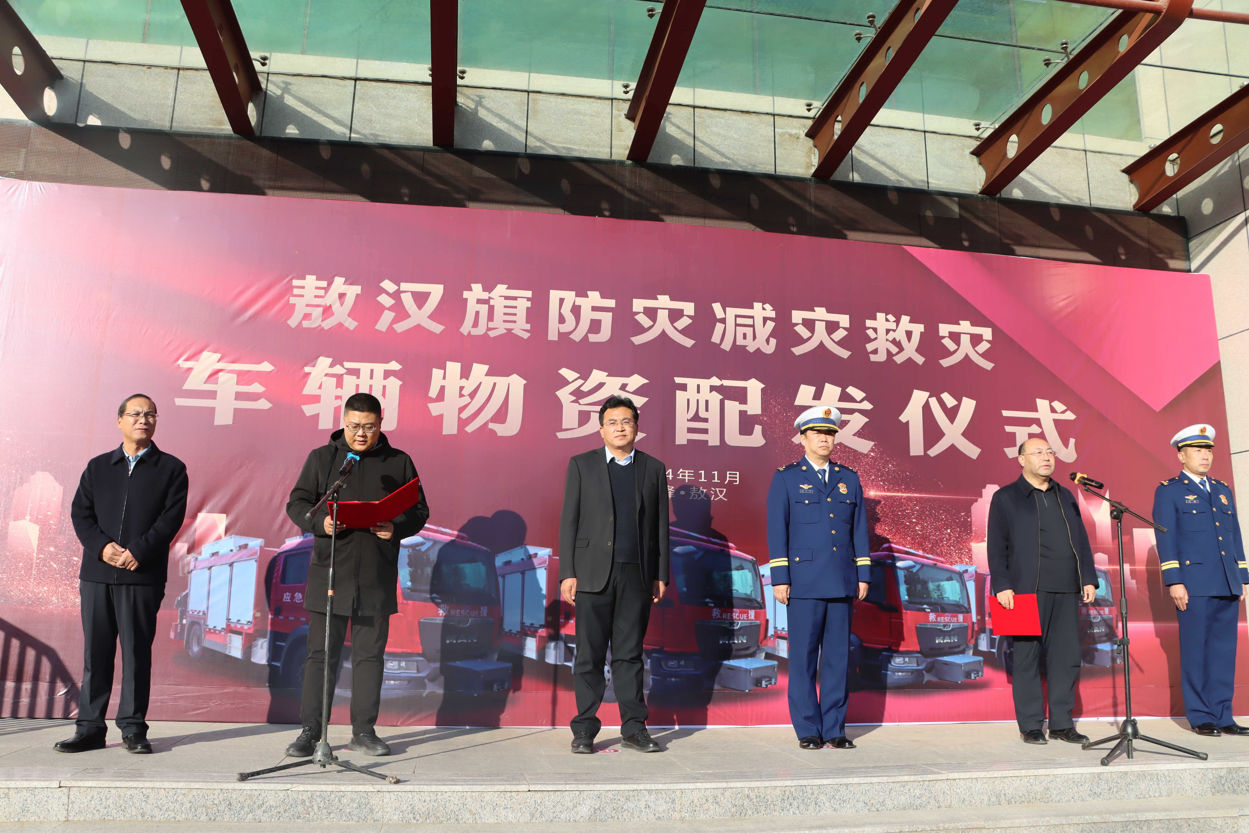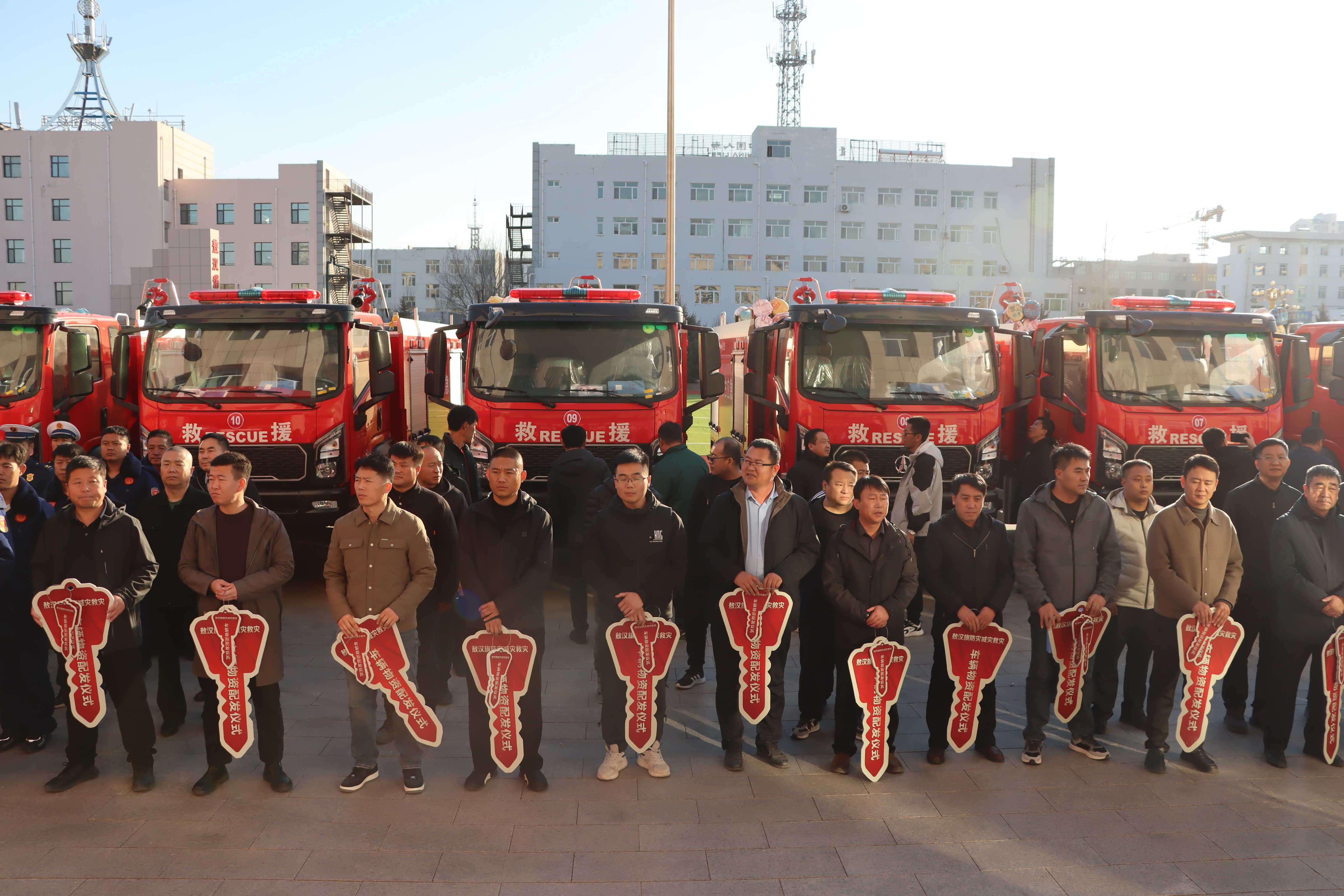 仪式上,旗防灾减灾救灾指挥部办公室主任、应急管理局局长刘长青宣读车辆物资配发决定,与会领导为各苏木乡镇、各应急救援队伍颁发车辆钥匙。本次配发的各类车辆物资系敖汉旗应急管理局向上级部门积极争取的国债物资装备,包括视频调度会议系统、森林草原火灾扑救车辆、水域救援车辆、抗洪抢险、综合保障等各类物资装备351(台)套,总价值约1500余万元,涉及通讯保障、预警指挥、基层防灾等项目。