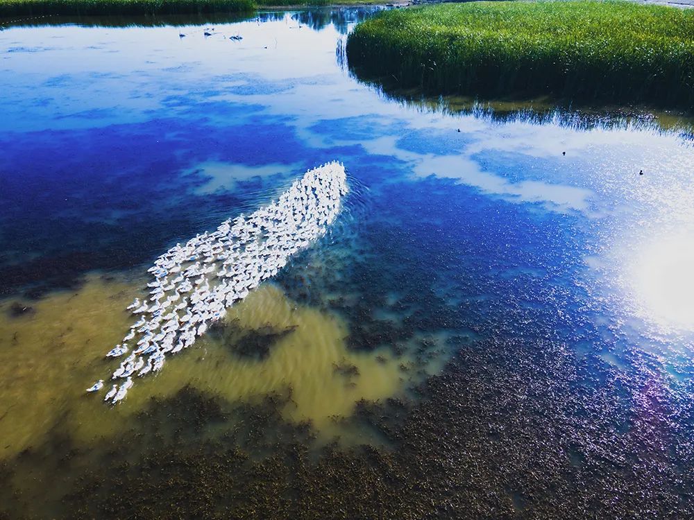 高空俯瞰成群结队的候鸟在水中游弋。(摄影:郝军)
