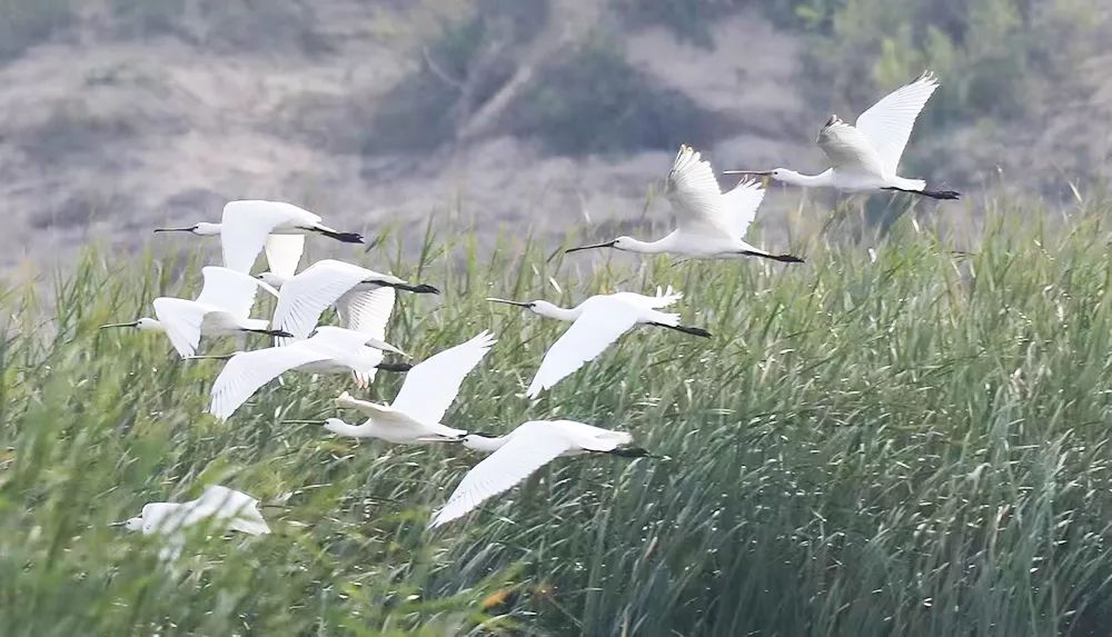 野生蓑羽鹤在芦苇上空盘旋。(摄影:胡江)