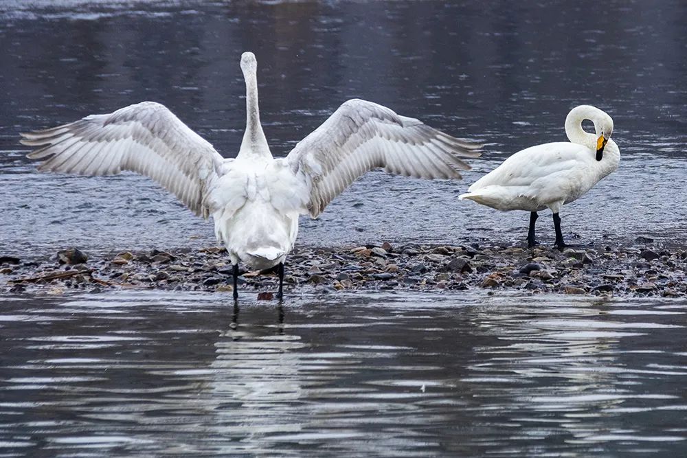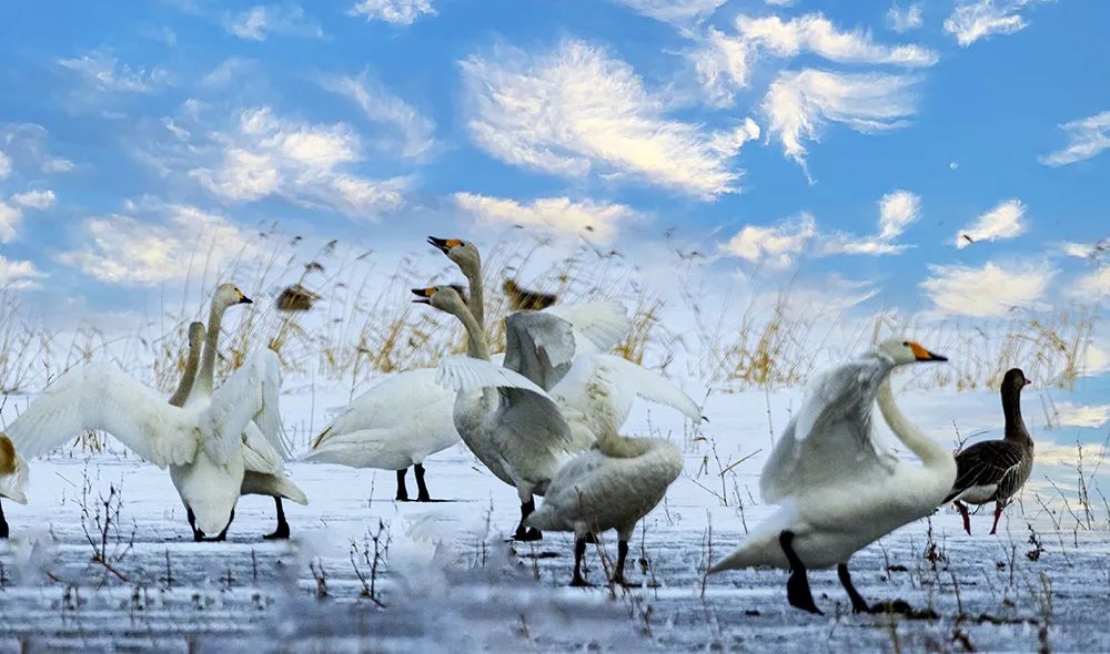 南飞天鹅在雪中翩翩起舞。(摄影:胡江)