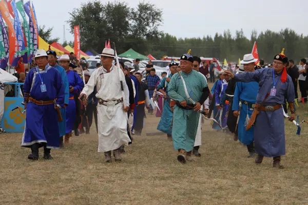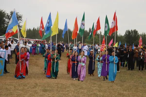 现场,彩旗招展、热闹非凡。国旗方队、那达慕大会会徽队、彩旗方队、哈达方队、搏克运动员队、射箭运动员队、拔河运动员队、裁判员队,8个方队身着盛装有序进场,依次亮相,热情的敖润苏莫苏木农牧民向与会领导和来宾敬献哈达。开幕式在庄严的国歌声中拉开帷幕,鲜艳的五星红旗冉冉升起,全体人员整齐队列、庄严肃立,面向国旗行注目礼。