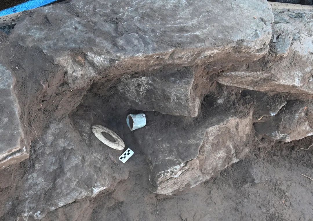 2024年累计发掘人骨遗存及墓葬共21处,包括台阶状竖穴土坑石棺墓、竖穴土坑石棺墓、石板瓮棺以及墙体堆积内出土的无墓圹墓。目前可确定为红山文化的墓葬有9座,其余12具人骨经过检测确定为夏家店下层文化时期。红山文化墓葬内出土陶杯、彩陶盘、蚌器、玉猪龙、斜口筒形器、玉冠饰、兽面带齿玉饰、玉环、玉璧等器物十余件。除此之外,出土的百余件玉石器大多集中于冢墙墙体内及冢南侧筒形器残片堆积中,主要有猪龙、钺、璜、璧、环、蚕、蝉、龟、鸟、鸮、斧、凿、锥以及各类钻芯、玉料、切割料等,其中以环及钻芯最多。这些玉石器中除了墓葬出土玉器器型完整外,其他地点出土多为残件。这些非出土于墓葬的玉器、火烧的动物骨骼、火烧小坑、石块简单围成内埋筒形器片祭祀坑以及整个垫土层大量分布的碳屑颗粒等现象,反映了南部方坛浓厚的祭祀之风。