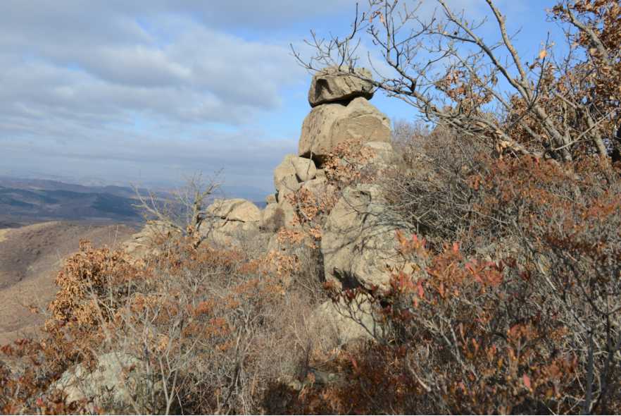 大黑山的奇峰异石同样令人叹为观止。海拔1074 米的平顶山直插云霄,次平山宛如青铜巨鼎巍然屹立,锥子山恰似天工雕琢的玉簪直指苍穹。还有那形态各异的磐石,有的如金蟾望月,有的似猴子观天,每一块石头都栩栩如生,仿佛被赋予了生命。站在巨石之上,眺望大黑山的巍峨身姿,一股对大自然鬼斧神工的敬畏之情油然而生。这些历经岁月洗礼的磐石,默默见证着大黑山的沧海桑田,诉说着大自然的神奇与伟大。