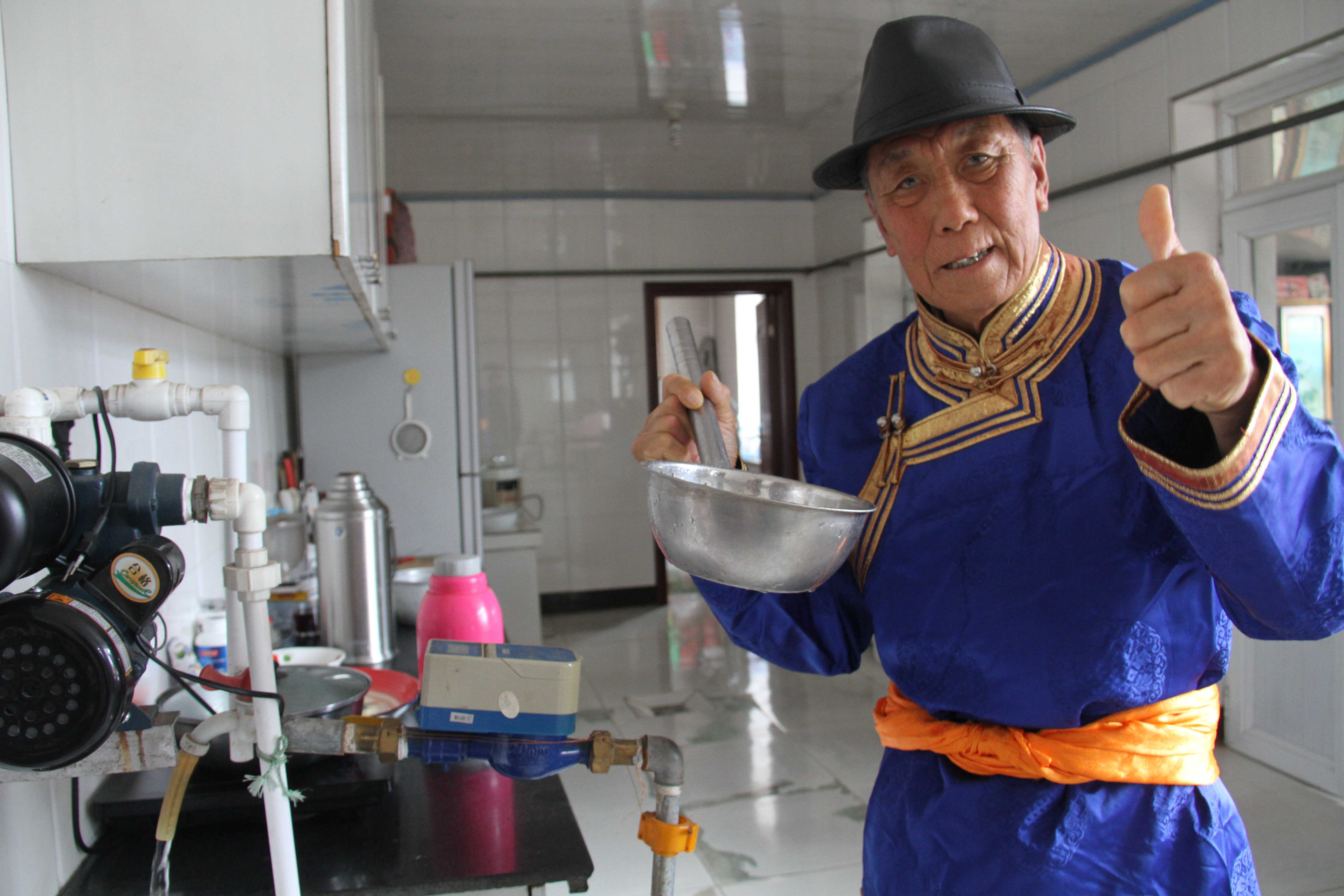一行人又来到乌兰章古嘎查48岁的蒙古族牧民布和巴图的家,布和巴图正在家中与前来的亲戚喝茶聊天,他说:“从前的水苦涩,浑浊,只能将就着喝。现在吃上了禹龙供水公司自来水,干净,水是甜的,旗委政府和旗水利局为咱牧民办了件大好事啊!”