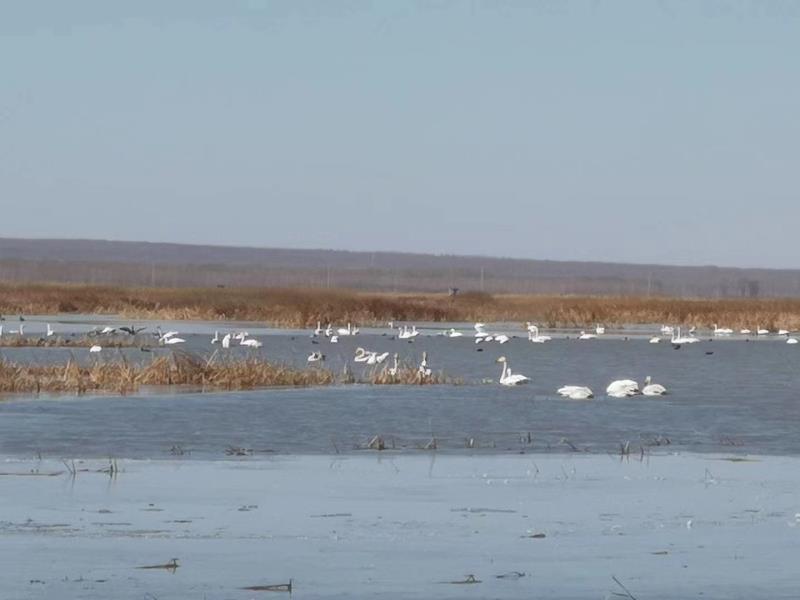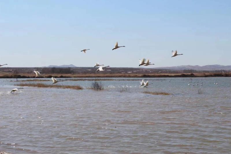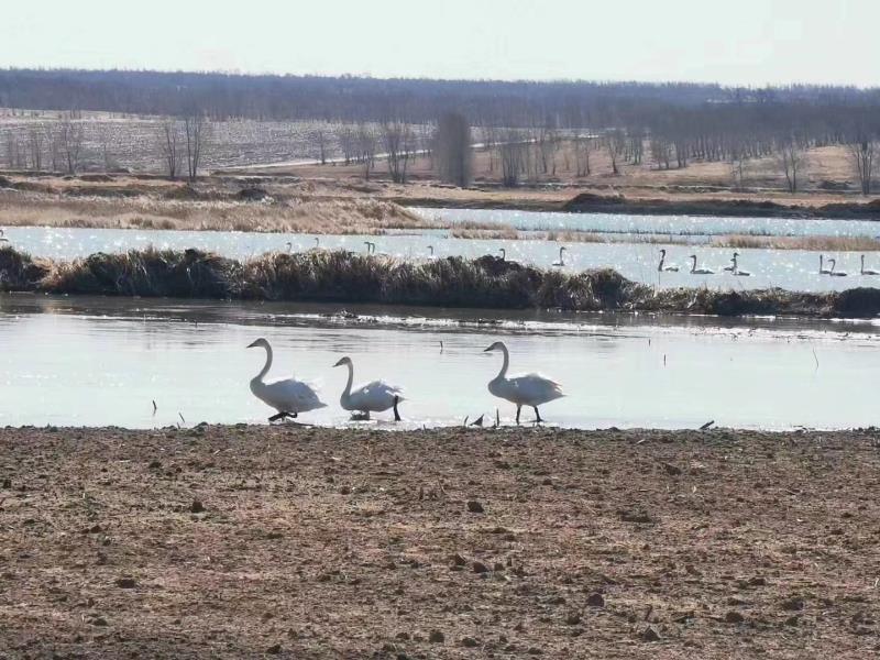 从3月初开始,敖汉旗山湾子水库小微湿地云集了大批北归的候鸟白天鹅、大雁、赤麻鸭等栖息,它们在水中觅食、嬉戏,补充能量,成为候鸟迁徙驿站。据业务部门监测统计,此次迁徙的候鸟多达近万只,有国家二级重点保护野生动物大天鹅 1899 只、小天鹅80 只、白琵鹭 5只、鸿雁 1327只,国家“三有”保护野生动物豆雁1610 只、灰雁539 只、赤麻鸭739 只、绿头鸭 854 只、凤头麦鸡12 只、鸬鹚 5只、苍鹭 3 只、凤头鸊鷉11 只、凤头潜鸭128只。还首次监测到中国“三有”保护动物黑翅长脚鹬,几年未曾出现的丹顶鹤。那么,今年的山湾子水库小微湿地缘何雁鹤翔集?