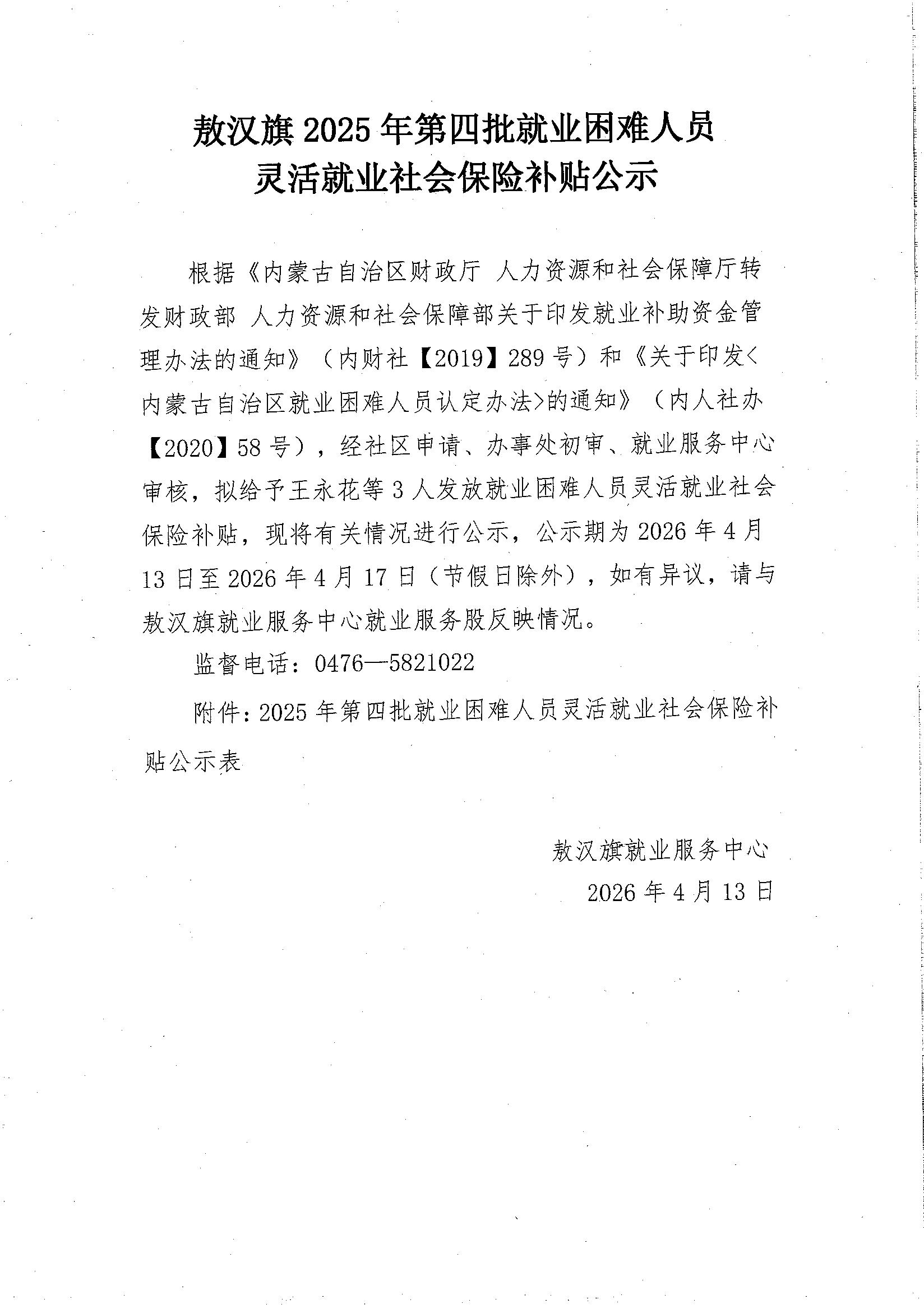敖汉旗2025年第四批就业困难人员灵活就业社会保险补贴公示