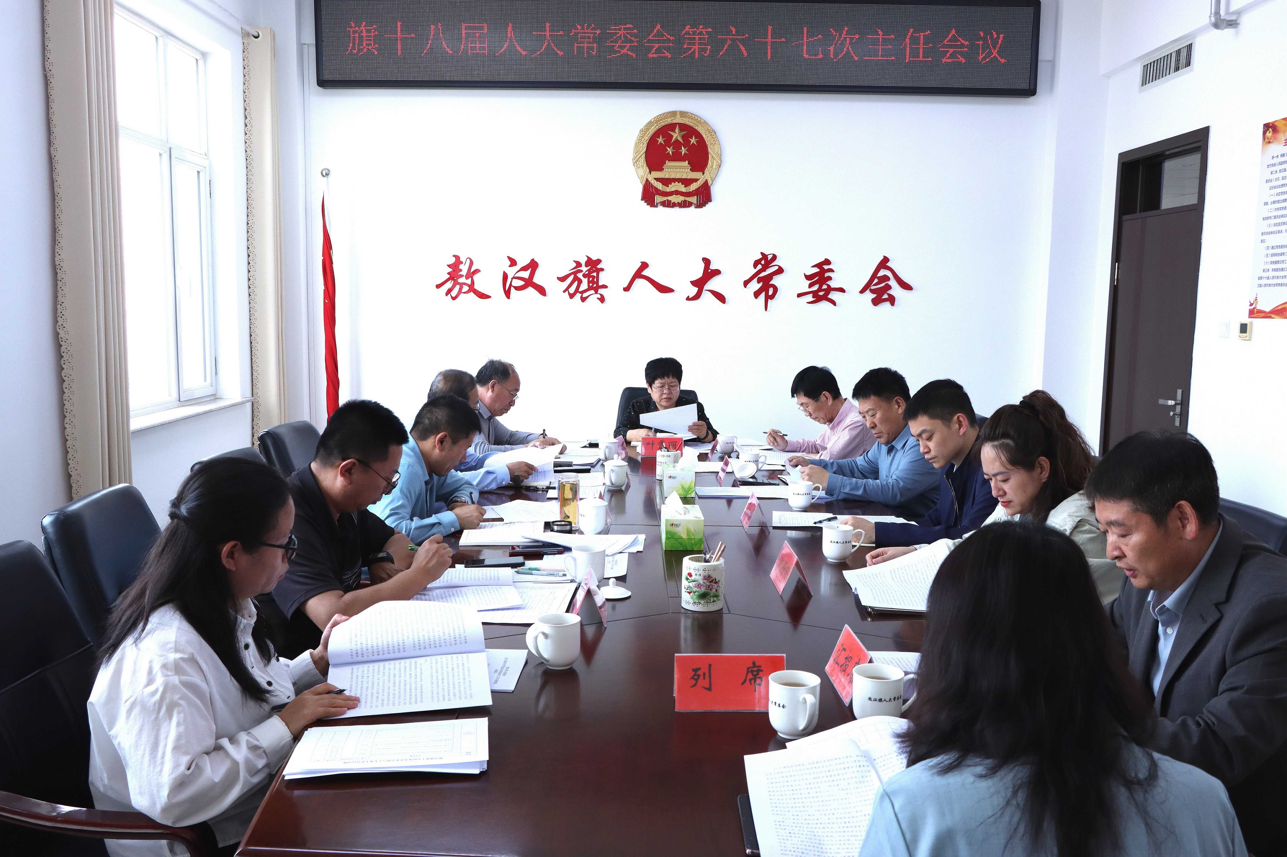 4月24日,旗十八届人大常委会召开第六十七次主任会议。旗人大常委会主任叶秀丽主持会议。副主任李明玉、冯云辉、赵常山、张旭东出席会议。旗政府副旗长罗乐添,旗政府办、民委、审计局、旗人民法院、赤峰市生态环境局敖汉旗分局有关负责同志及旗人大常委会相关委室主任、副主任列席会议。