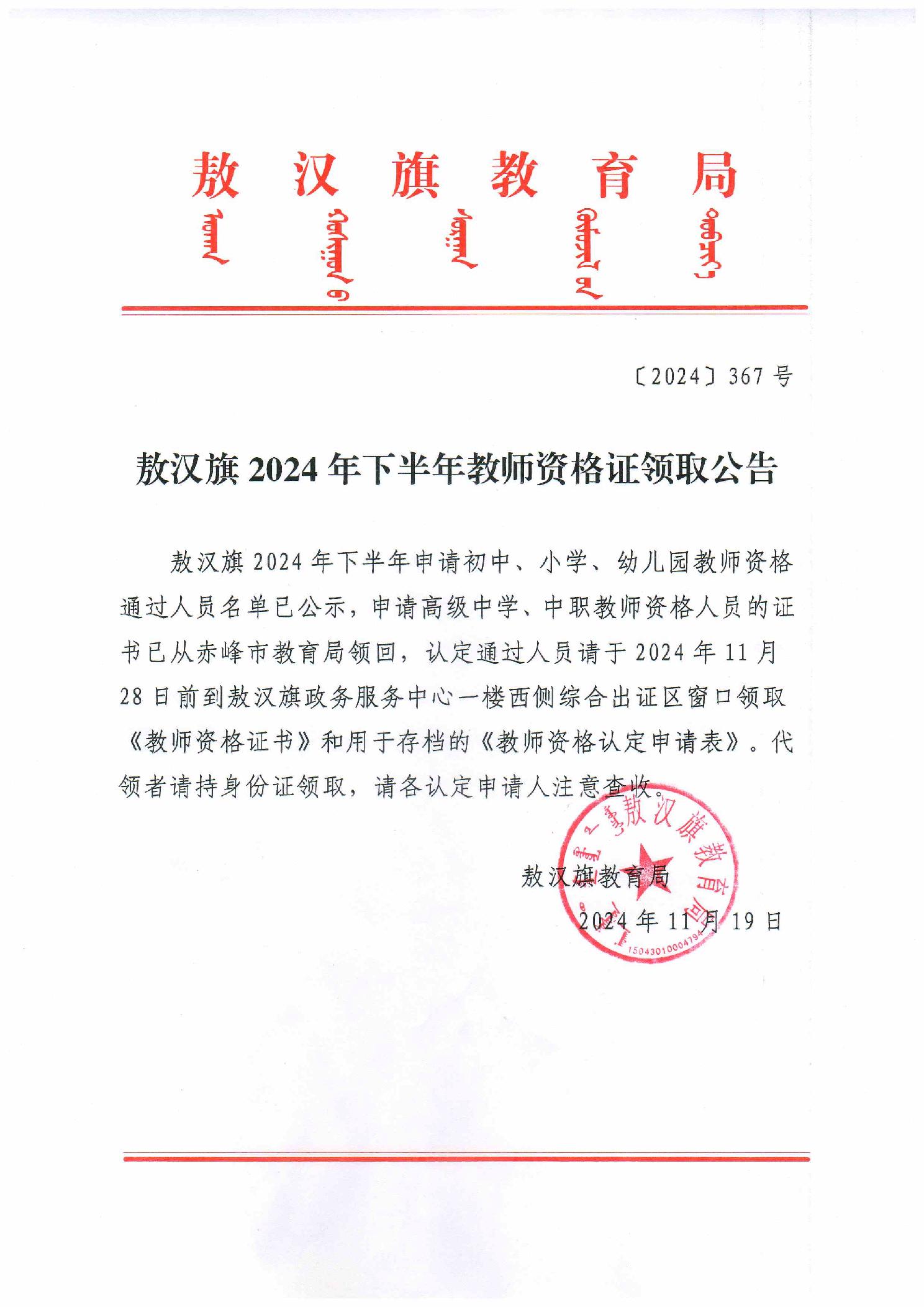 敖汉旗2024年下半年教师资格证领取公告