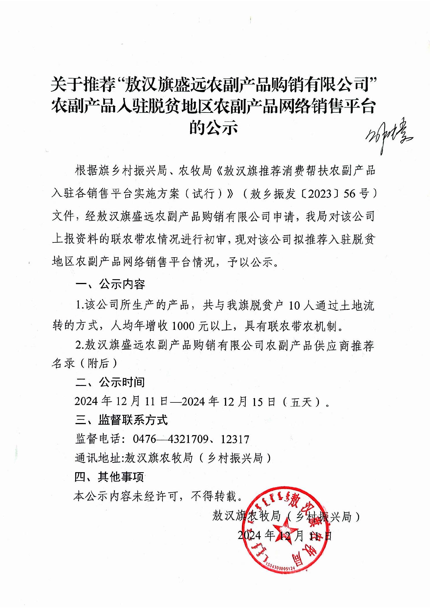关于推荐“敖汉旗盛远农副产品购销有限公司”农副产品入驻脱贫地区农副产品网络销售平台的公示
