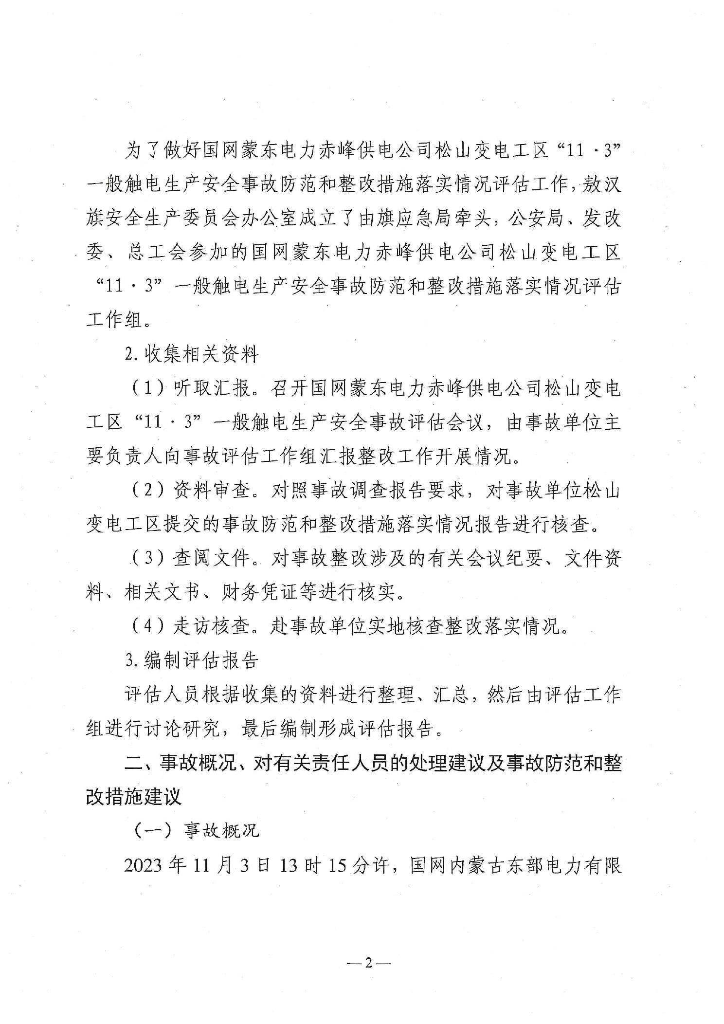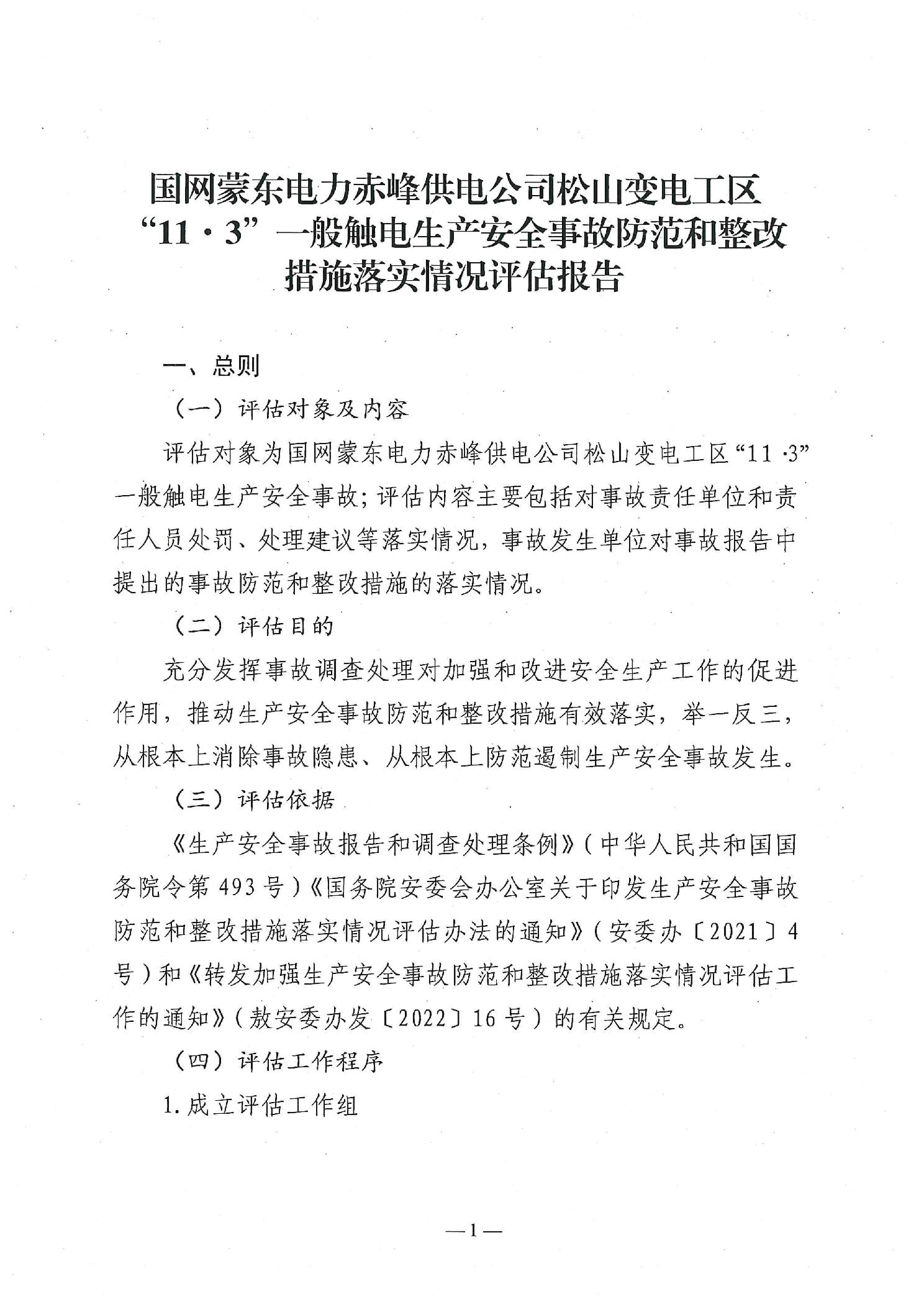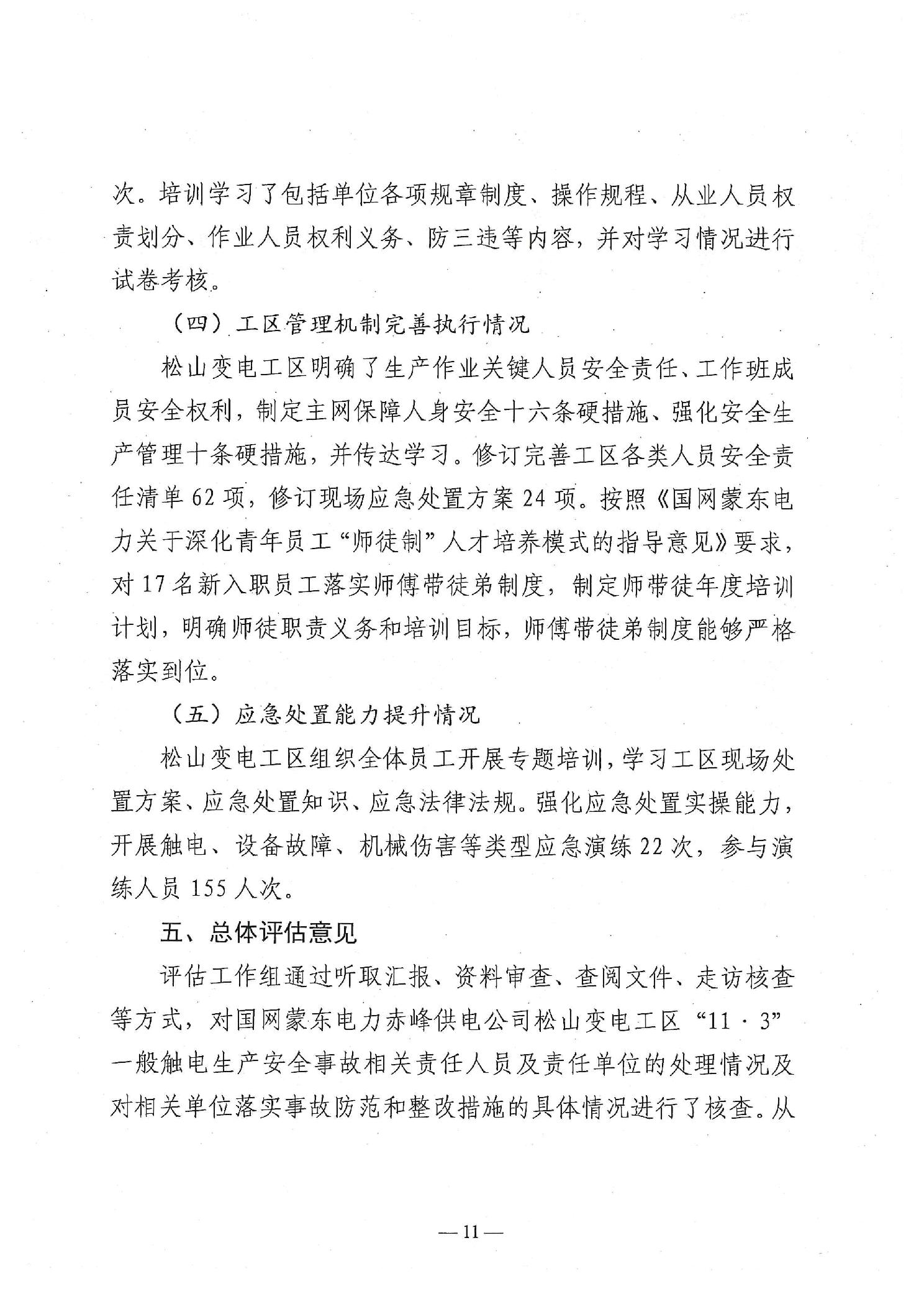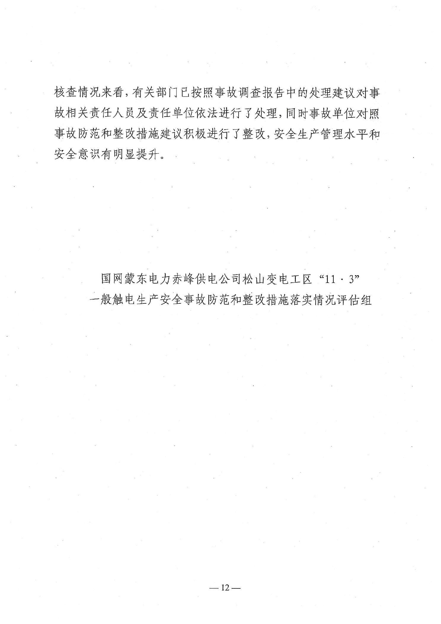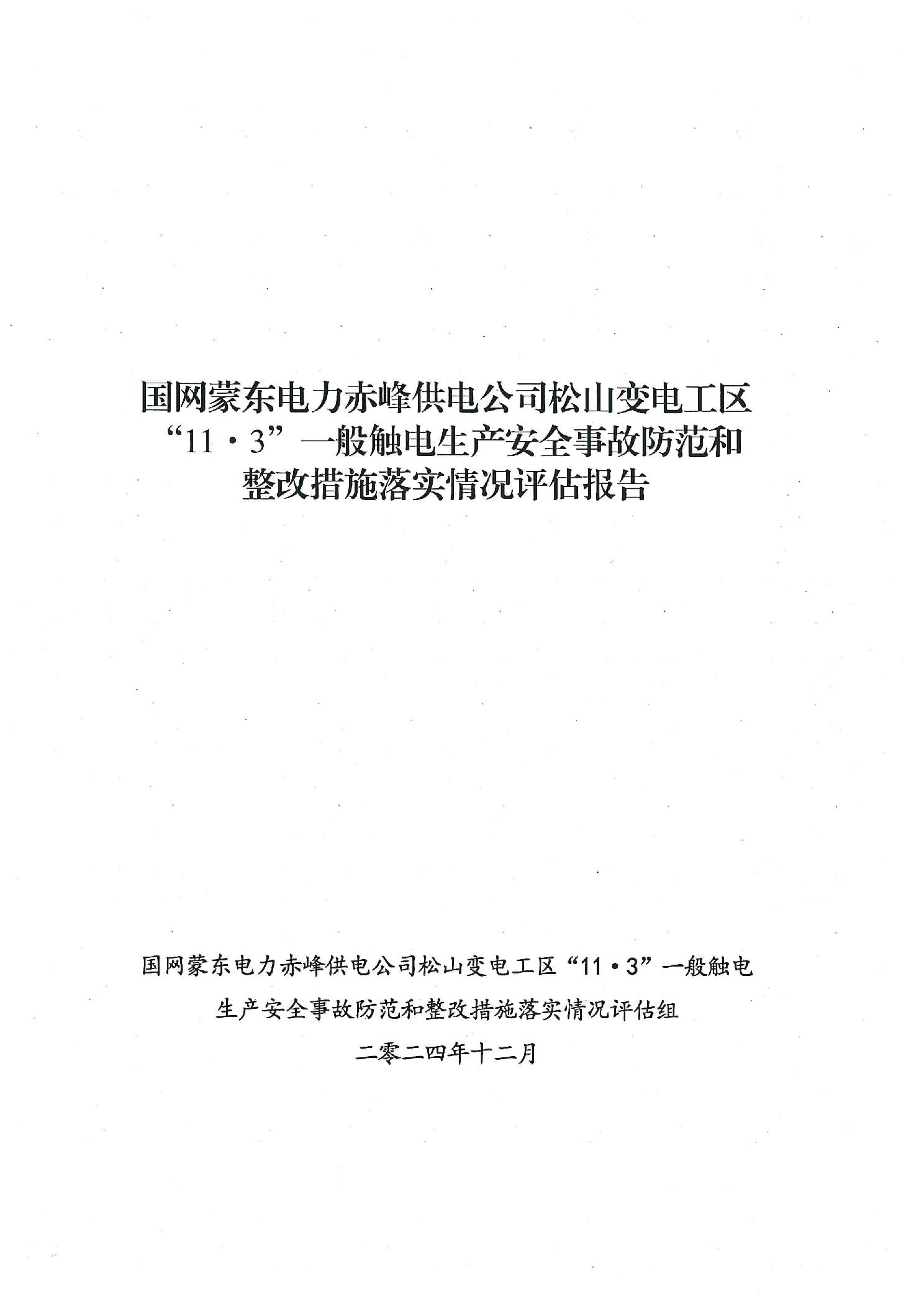 国网蒙东电力赤峰供电公司松山变电工区“11·3”一般触电生产安全事故防范和整改措施落实情况评估报告