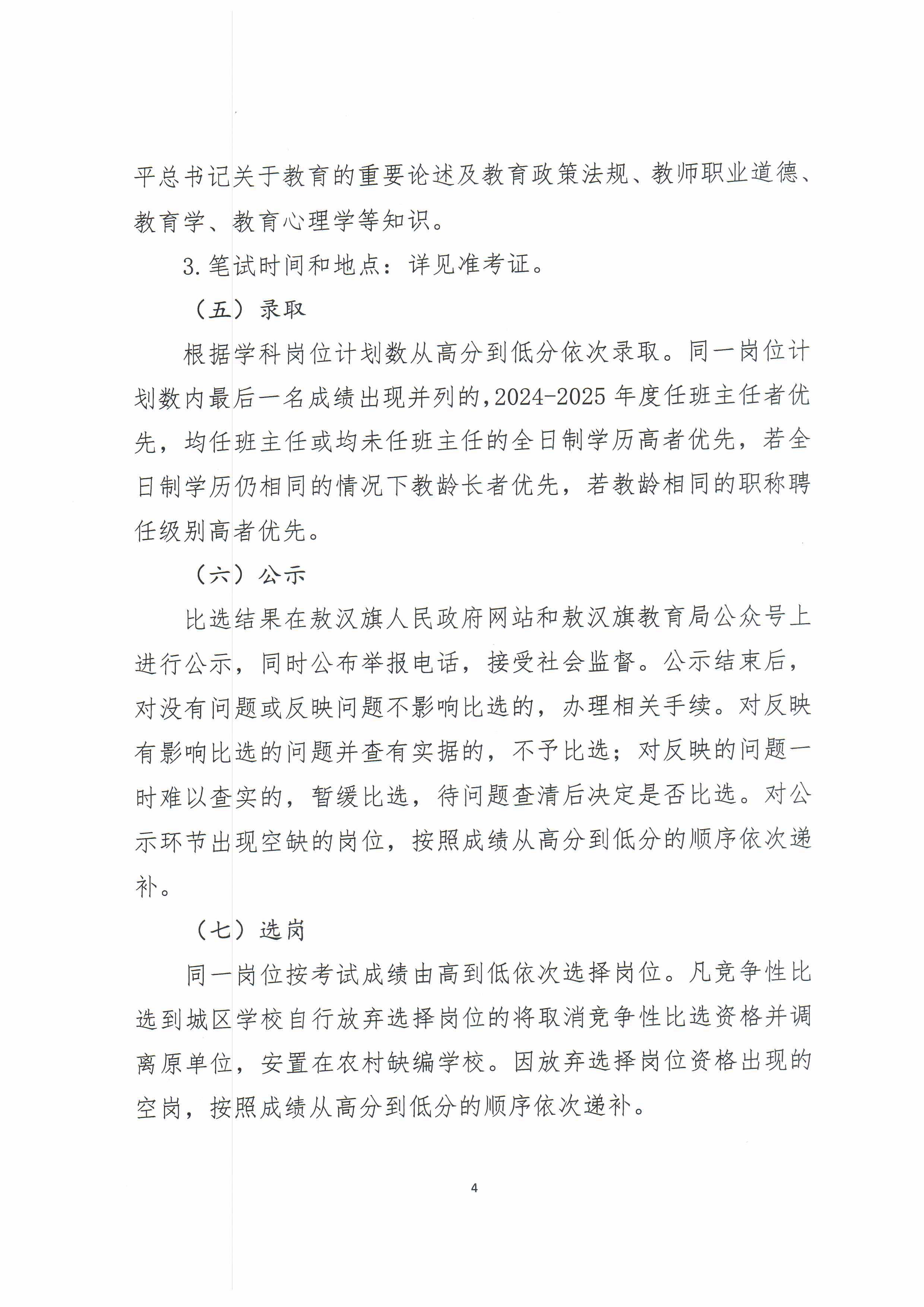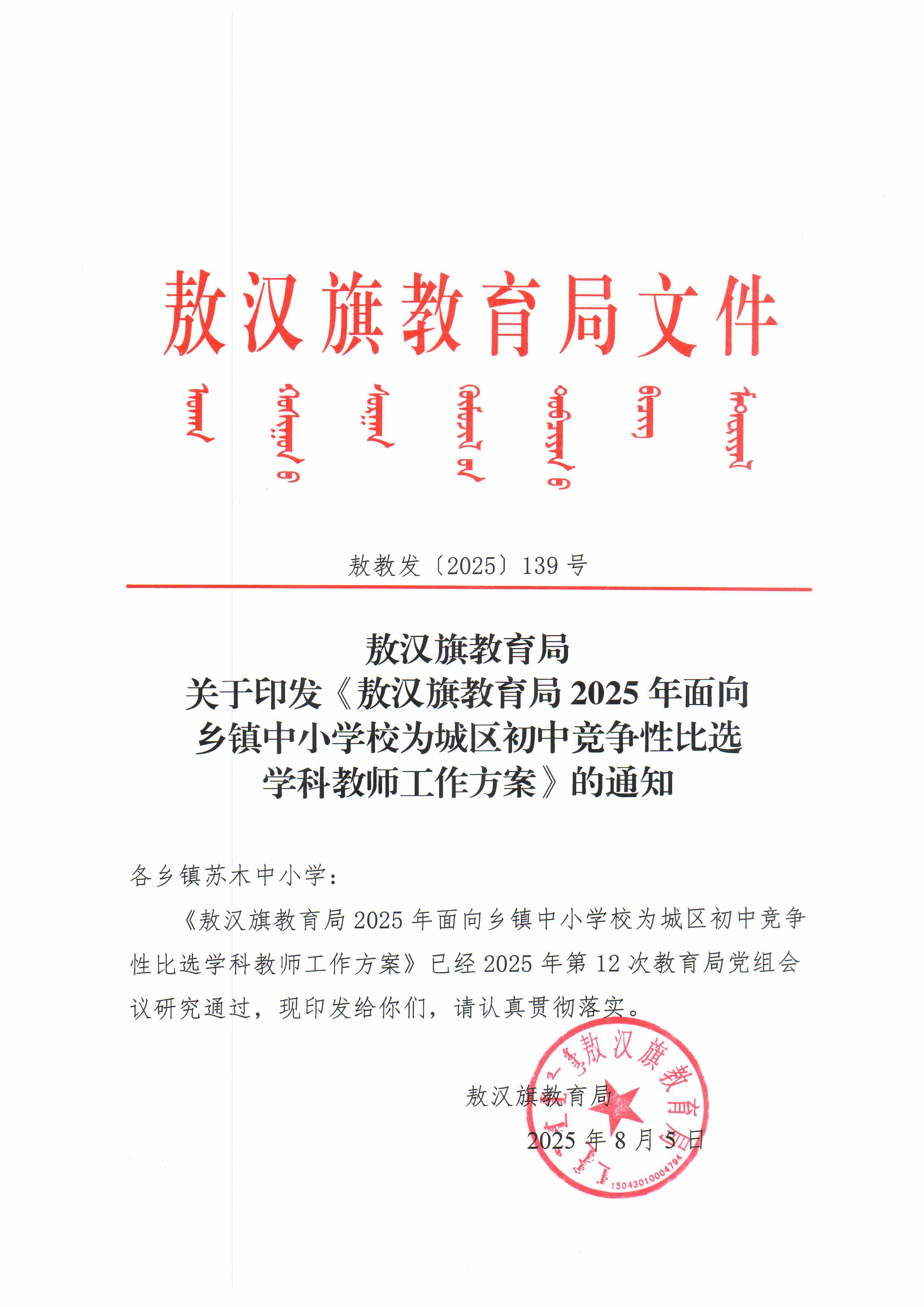 敖汉旗教育局关于印发《敖汉旗教育局2025年面向乡镇中小学校为城区初中竞争性比选学科教师工作方案》的通知