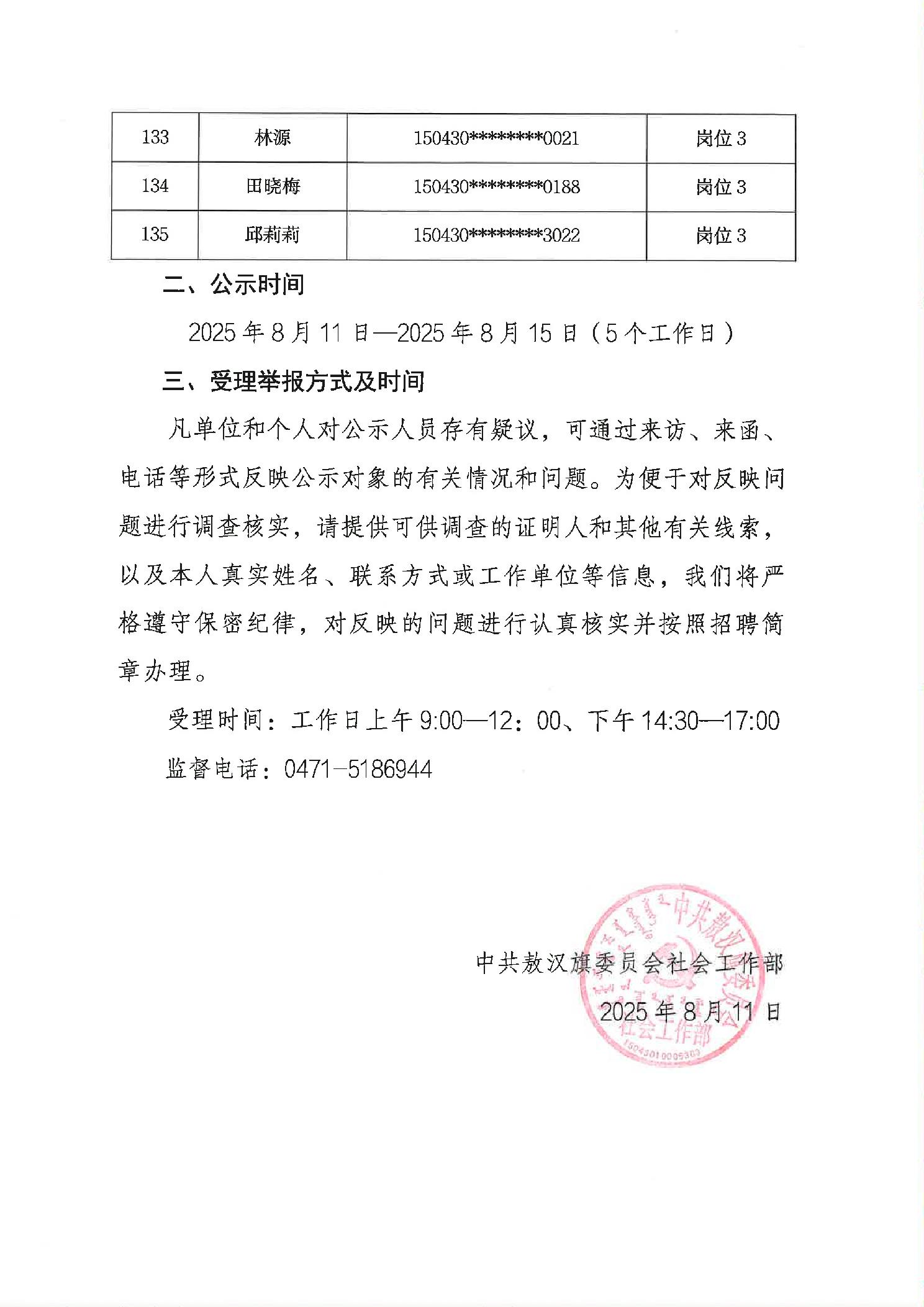 敖汉旗2025年公开招聘社区工作者拟聘用人员名单公示