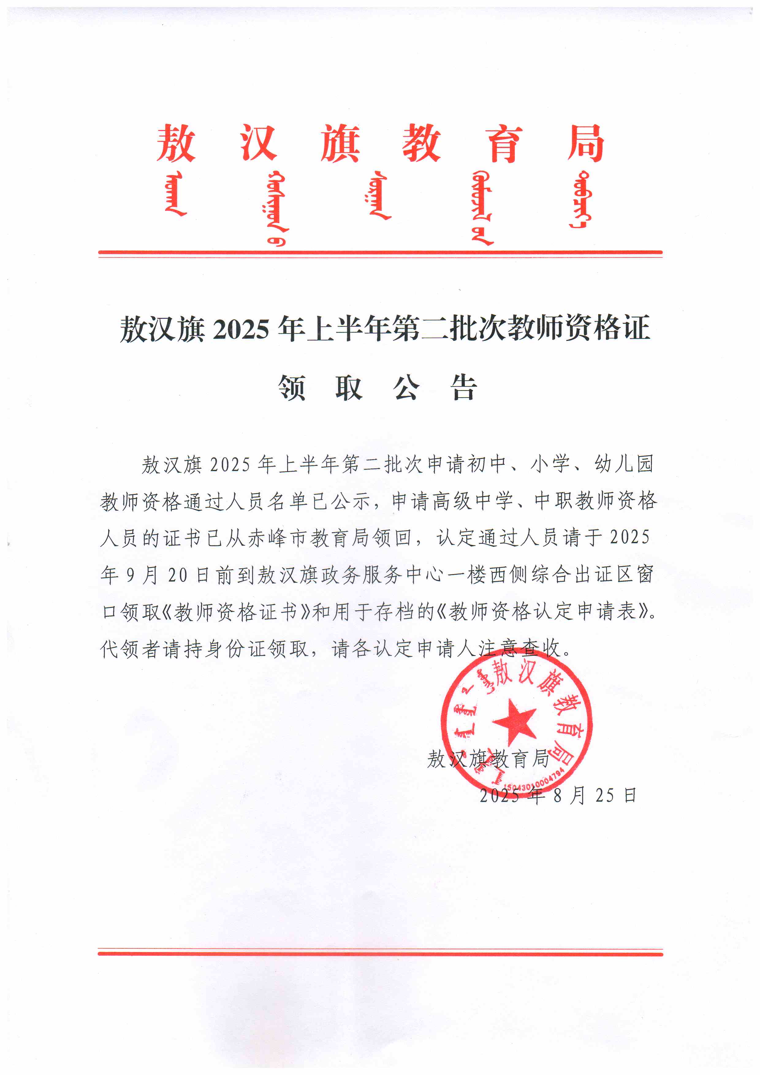 敖汉旗2025年上半年第二批次教师资格证领取公告