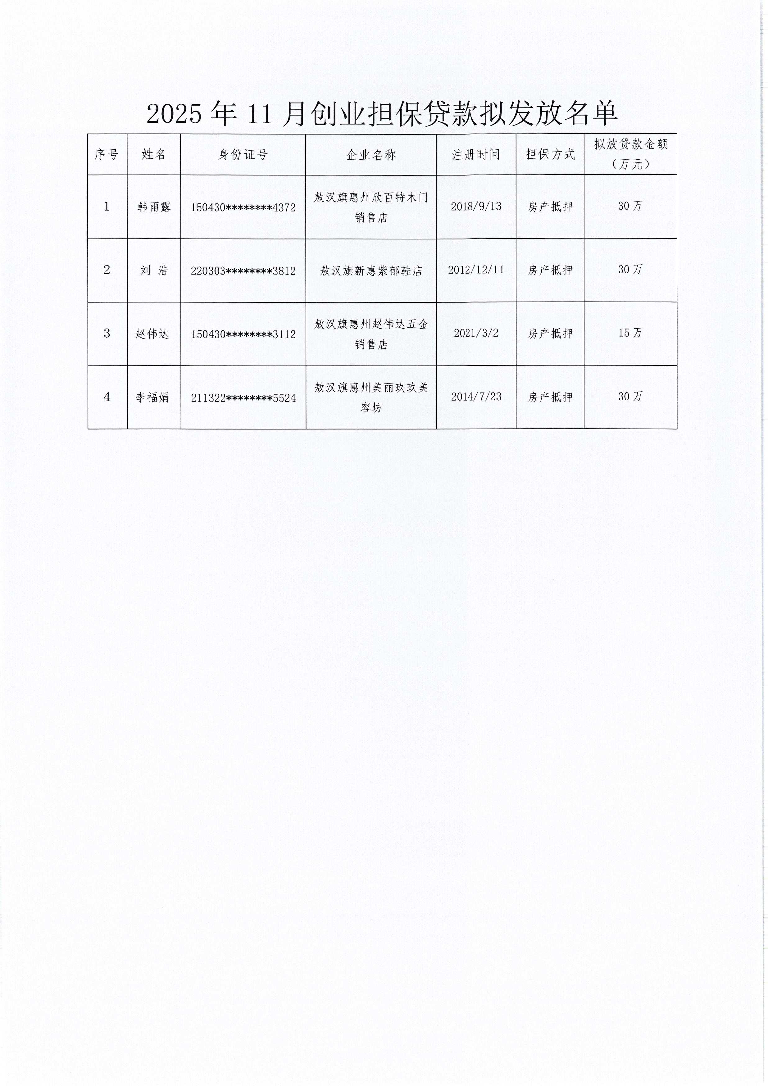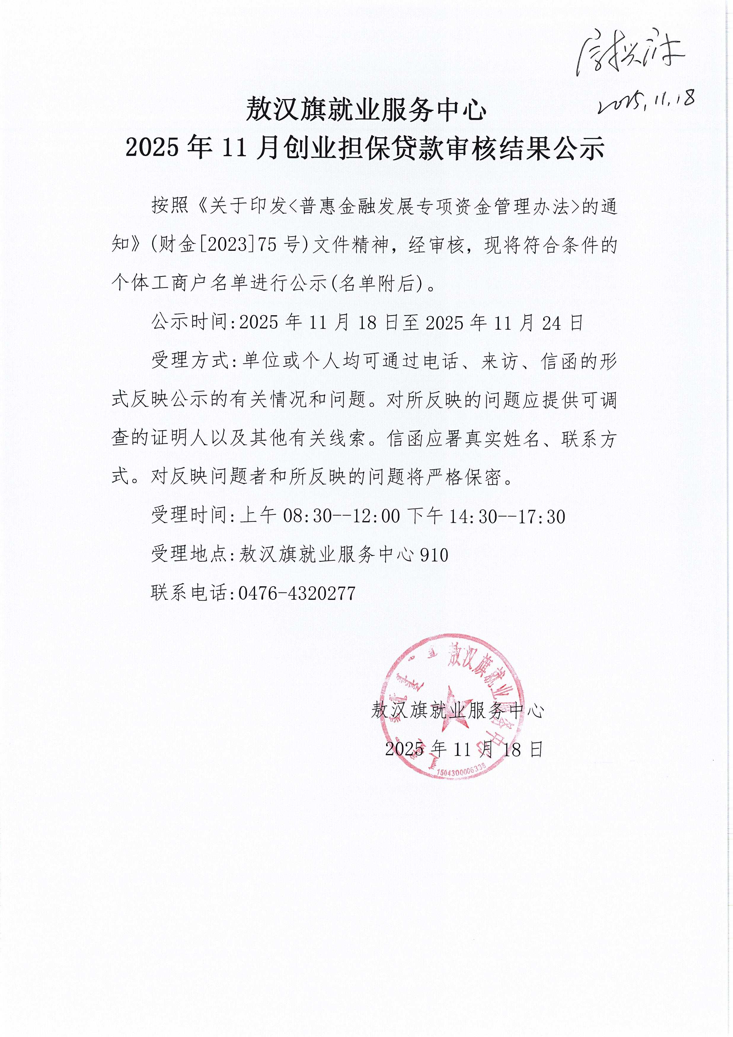 敖汉旗就业服务中心2025年11月创业担保贷款审核结果公示