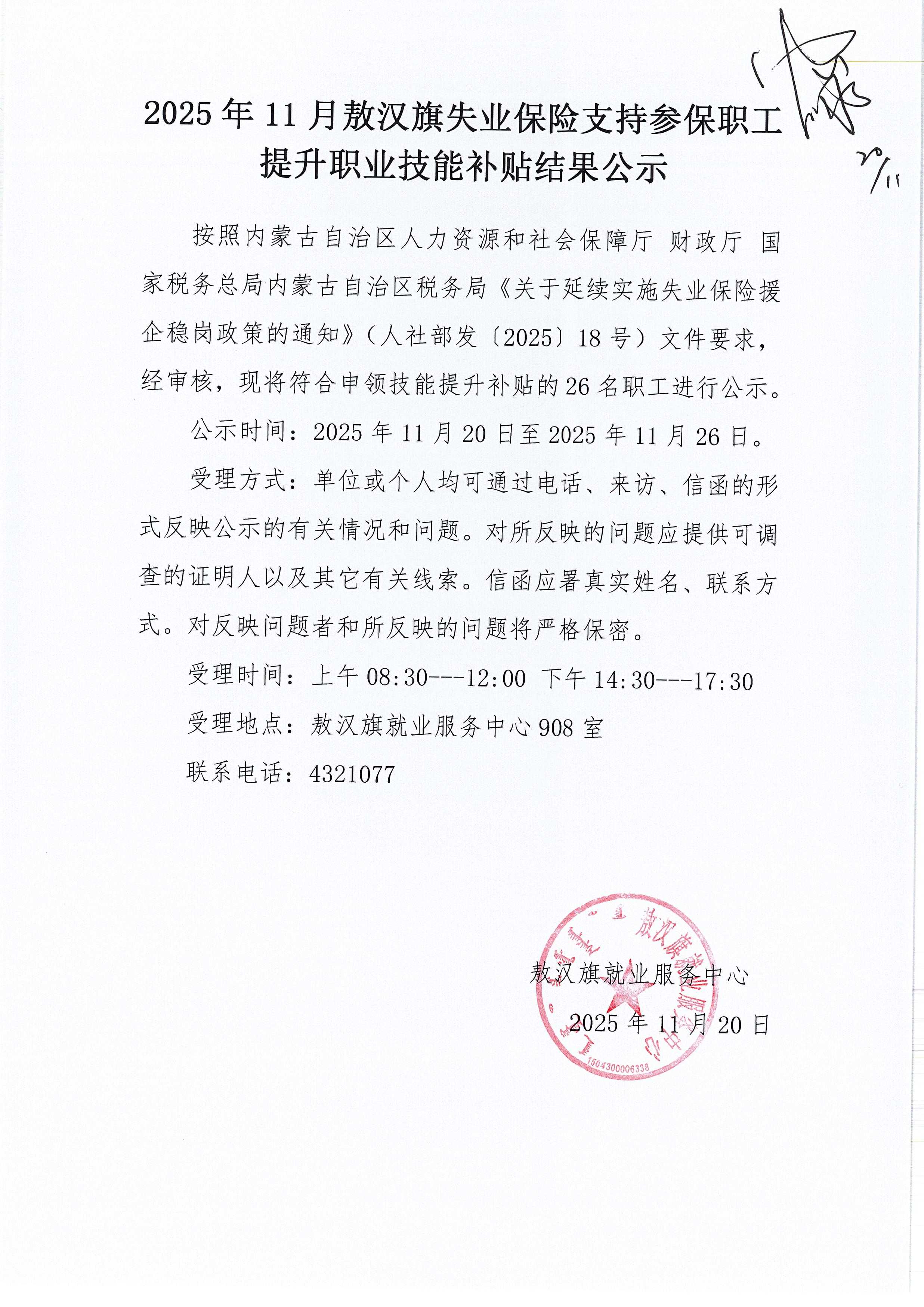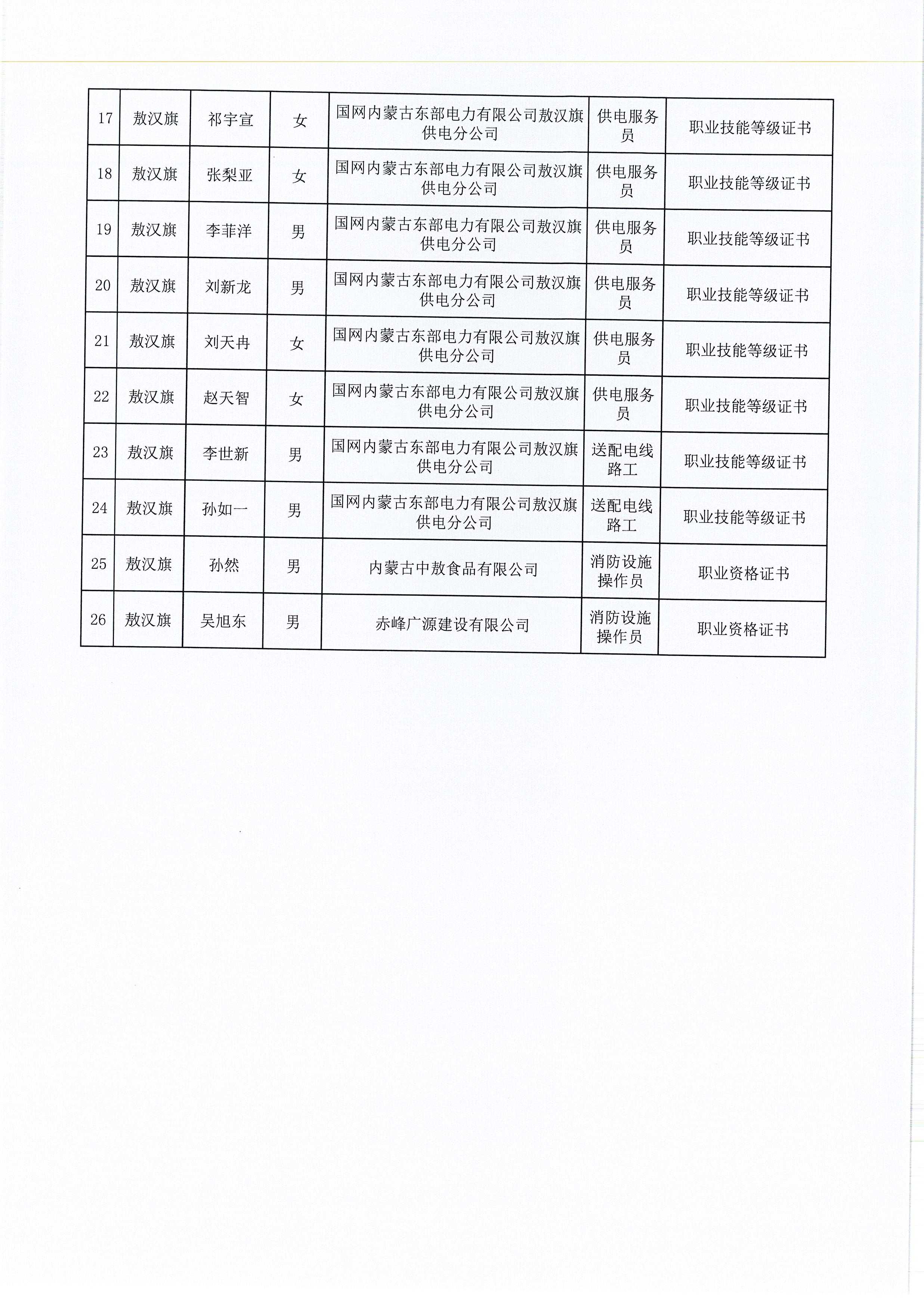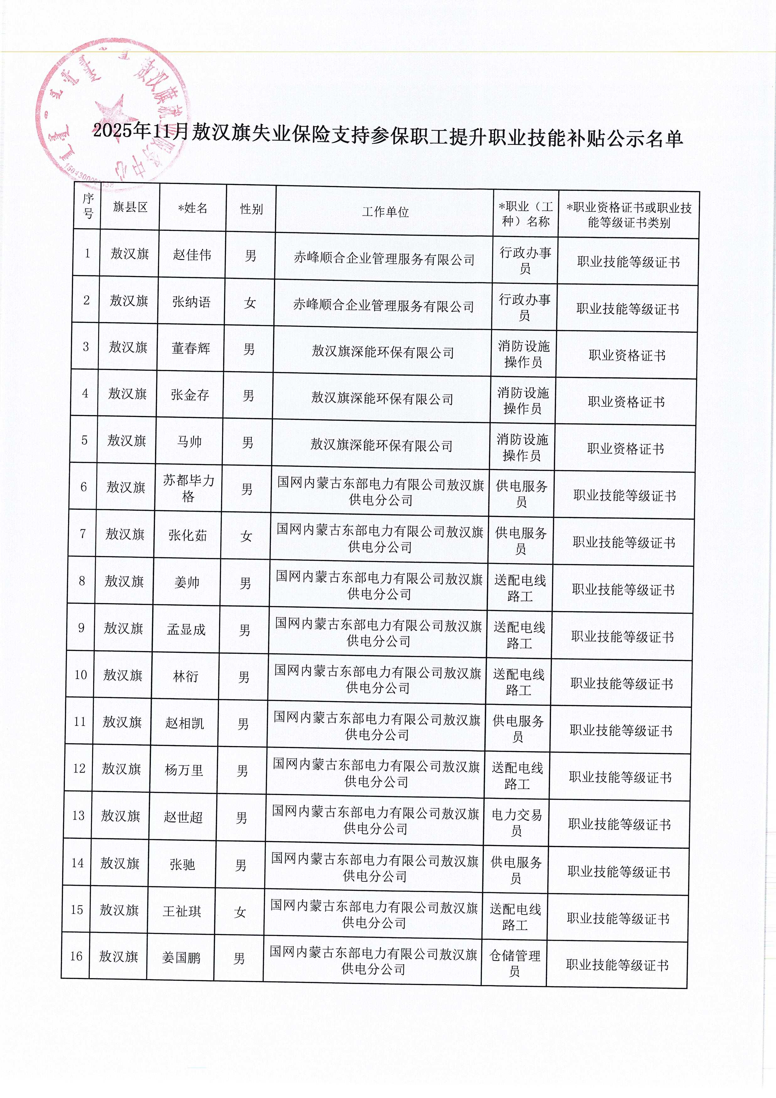 2025年11月敖汉旗失业保险支持参保职工提升职业技能补贴结果公示