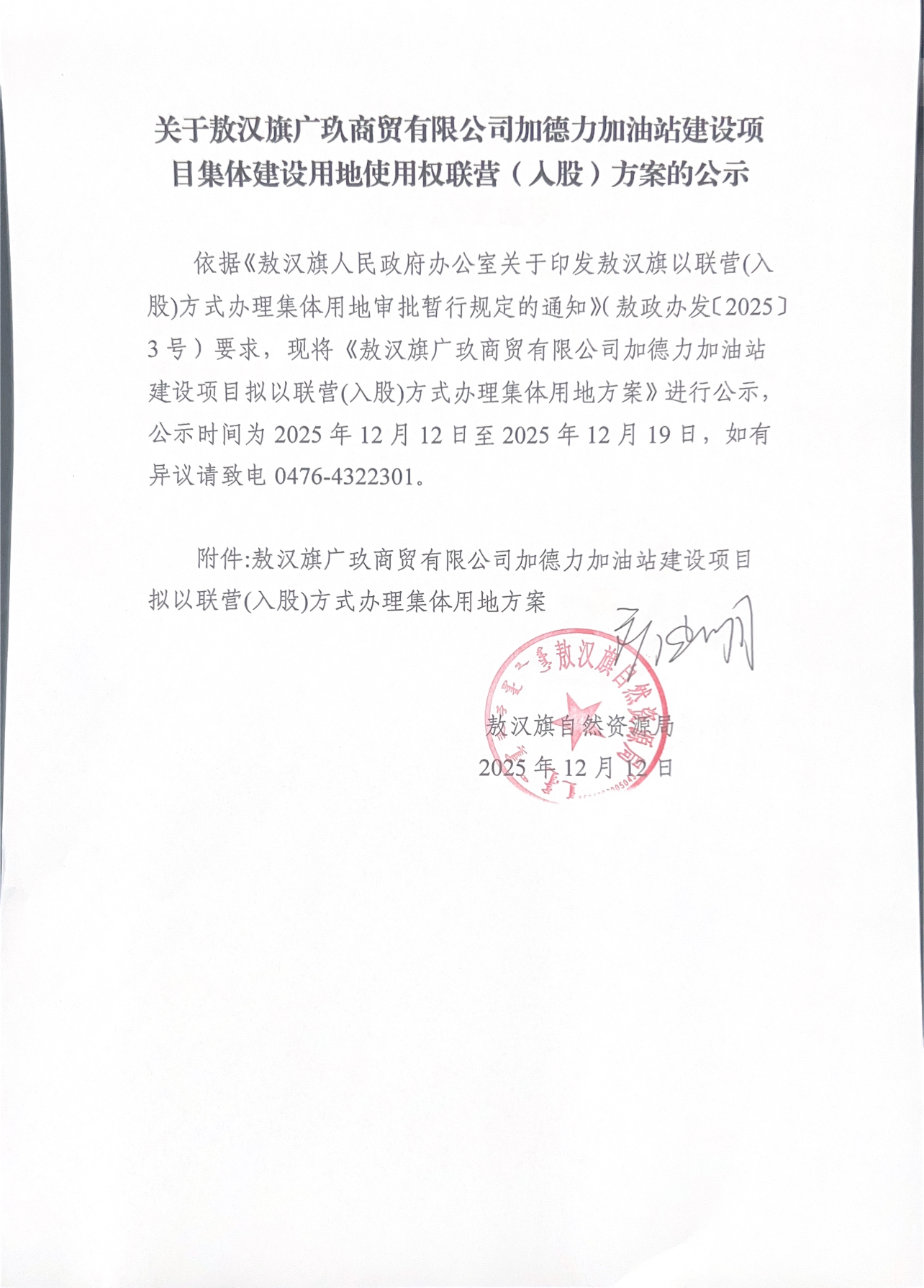 关于敖汉旗广玖商贸有限公司加德力加油站建设项目集体建设用地使用权联营(入股)方案的公示