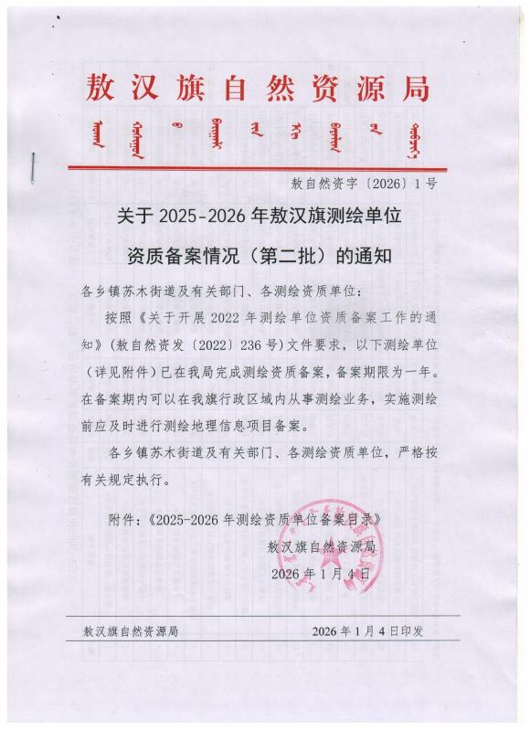 关于2025-2026年敖汉旗测绘单位资质备案情况(第二批)的通知