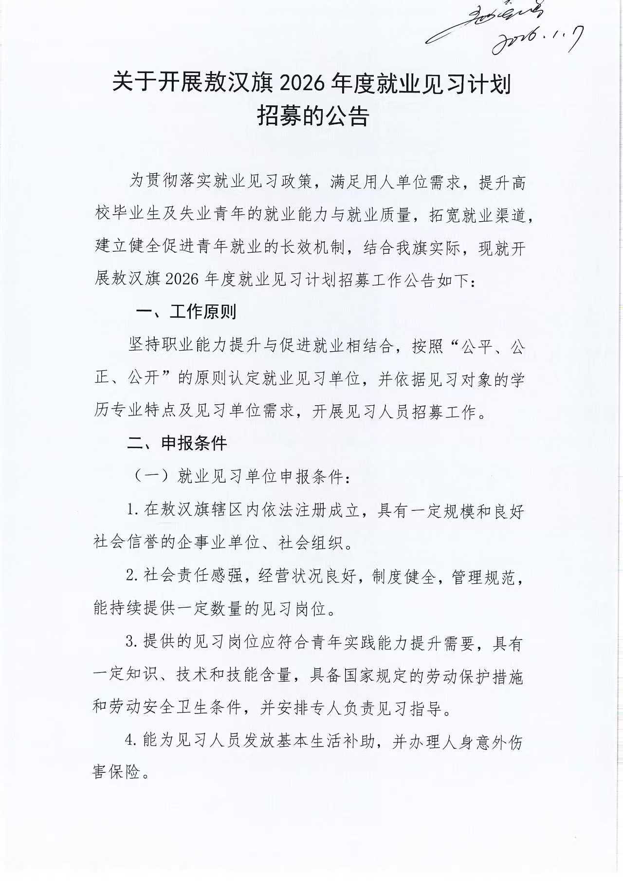 关于开展敖汉旗2026年度就业见习计划招募的公告