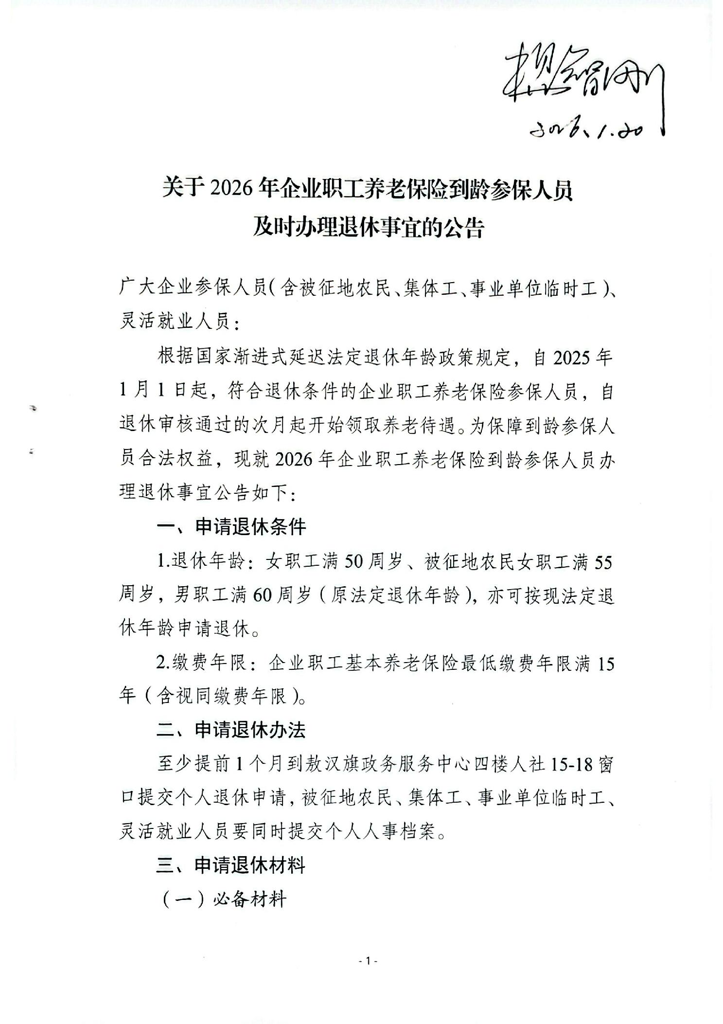 关于2026年企业职工养老保险到龄参保人员及时办理退休事宜的公告