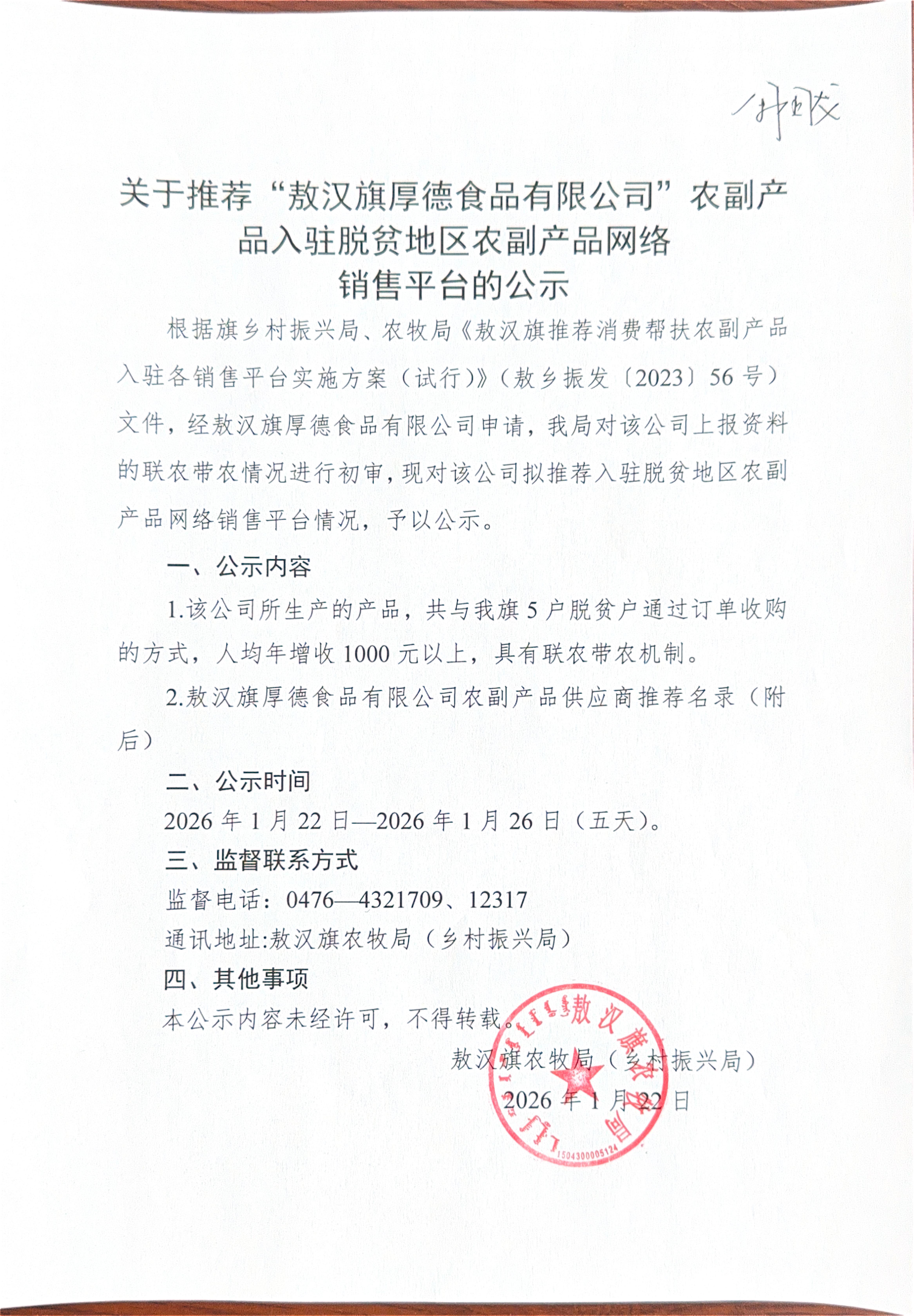 关于推荐“敖汉旗厚德食品有限公司”农副产品入驻脱贫地区农副产品网络销售平台的公示