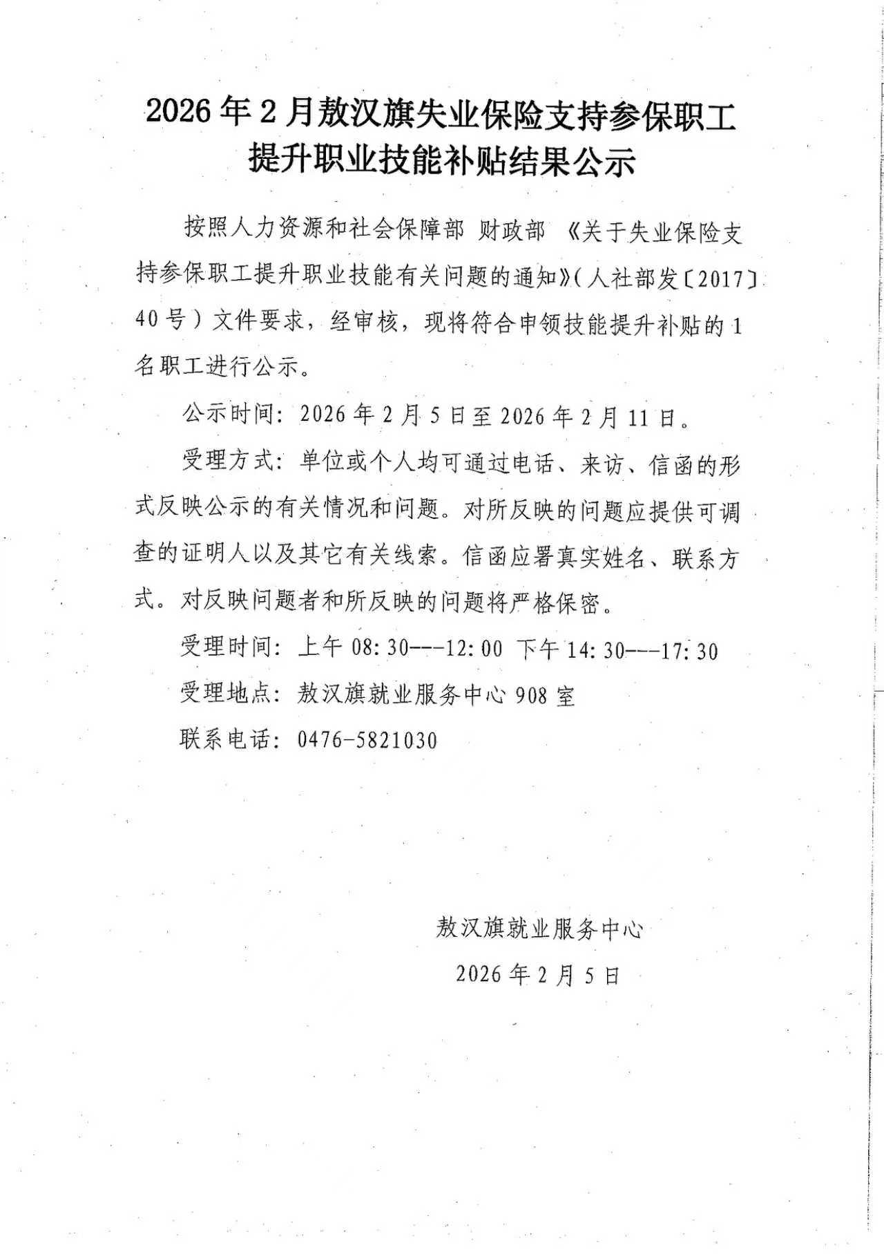 2026年2月敖汉旗失业保险支持参保职工提升职业技能补贴结果的公示
