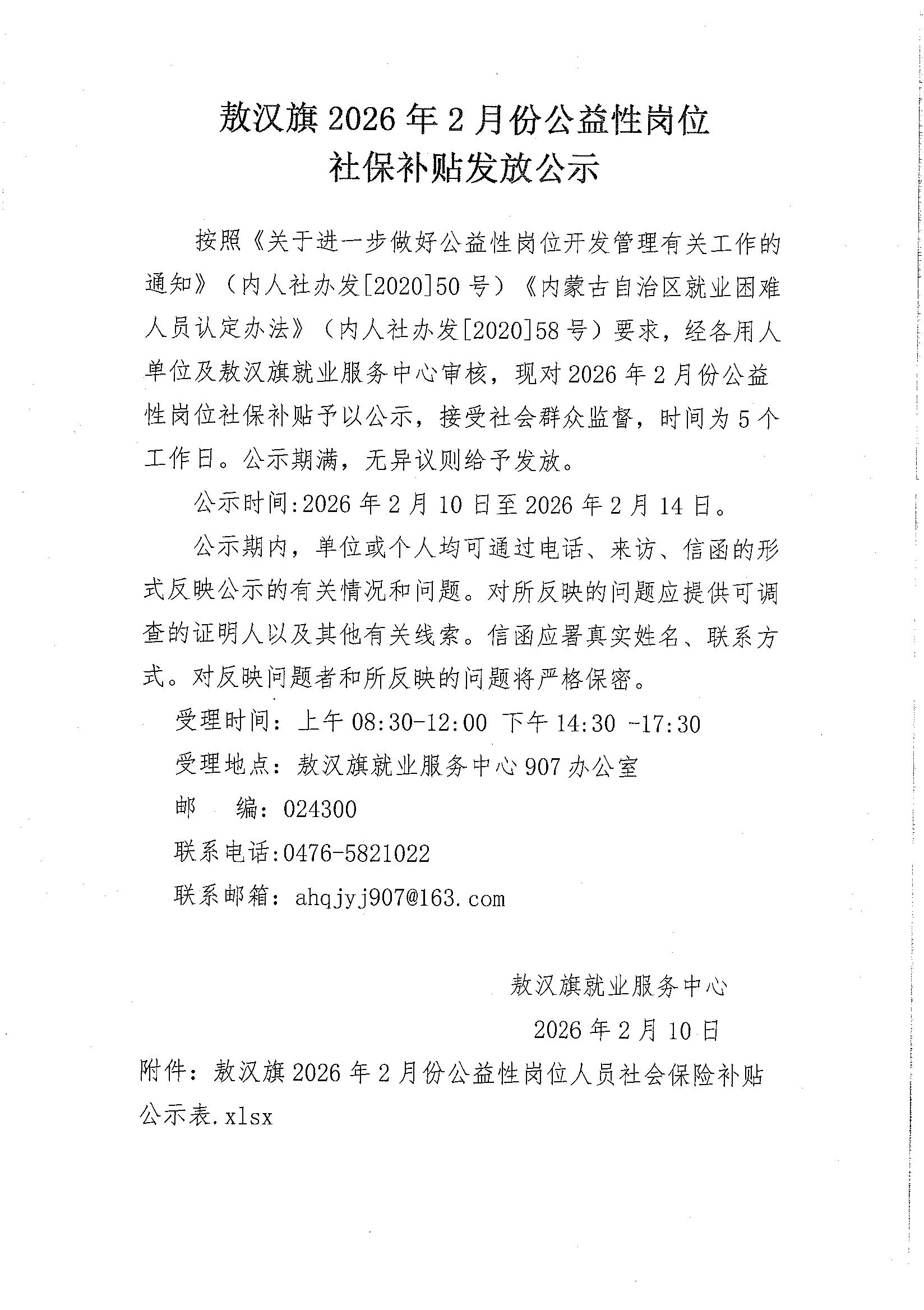 敖汉旗2026年2月份公益性岗位社保补贴发放公示