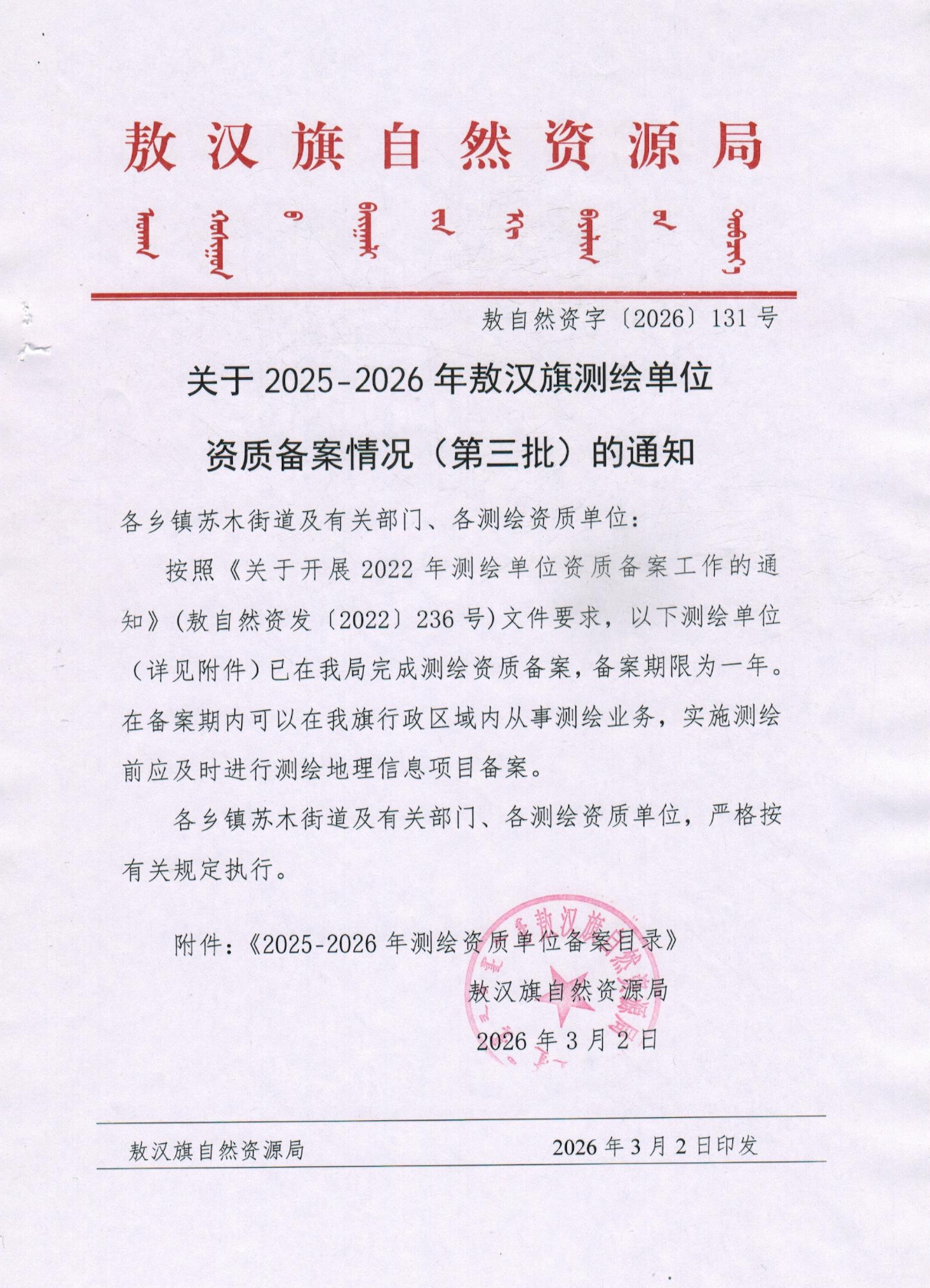 关于2025-2026年敖汉旗测绘单位资质备案情况(第三批)的通知