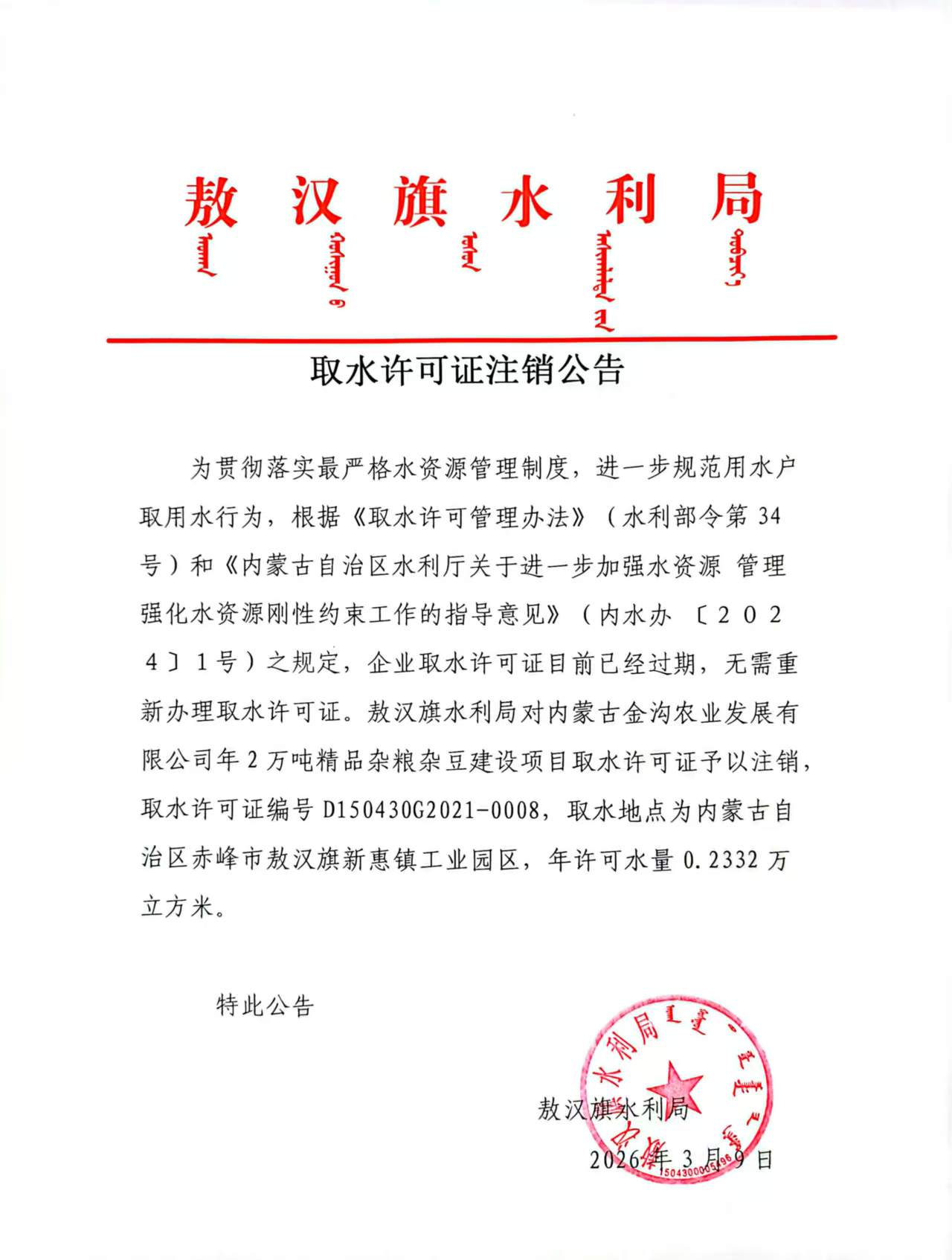 取水许可证注销公告