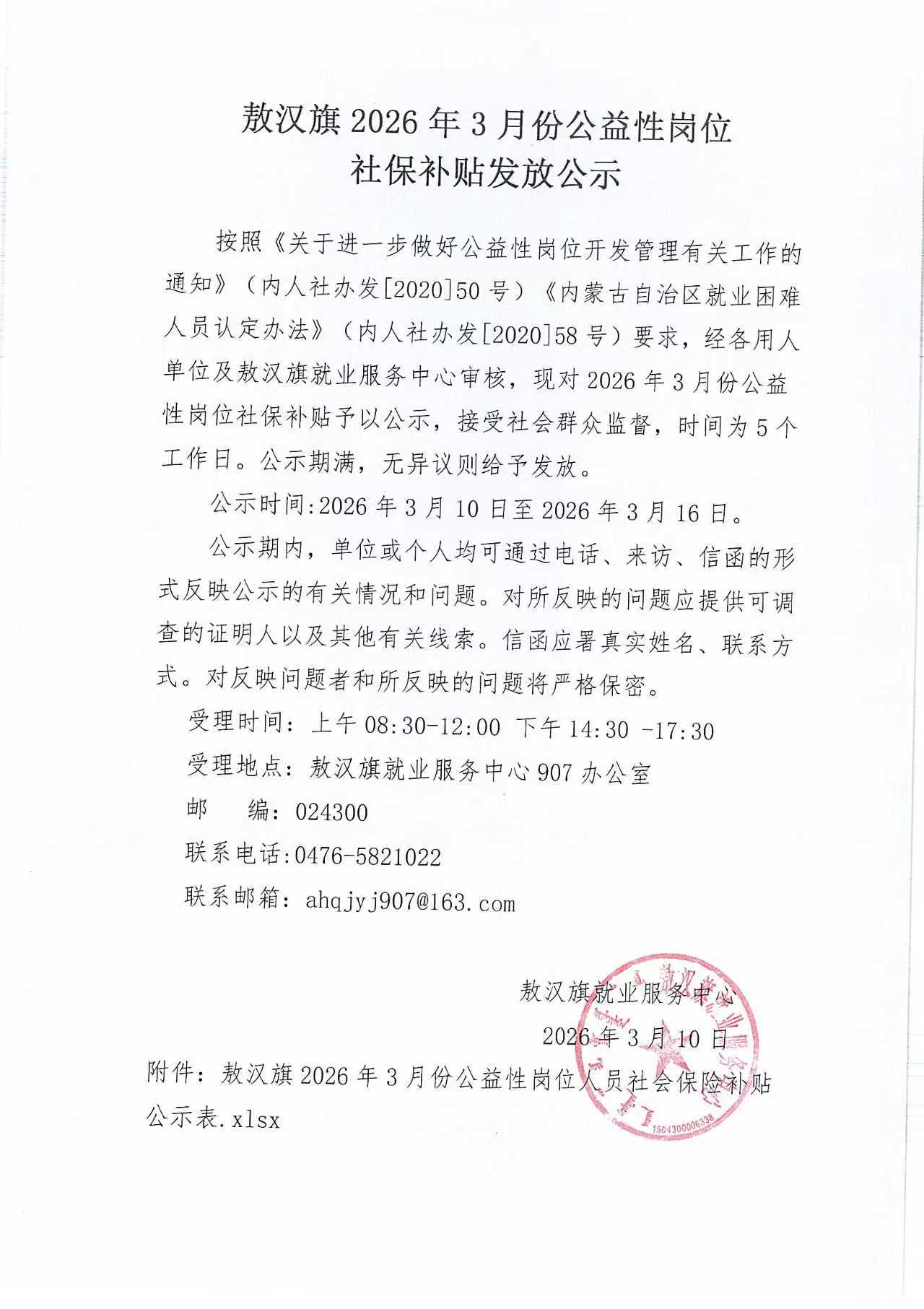 敖汉旗2026年3月份公益性岗位社保补贴发放公示