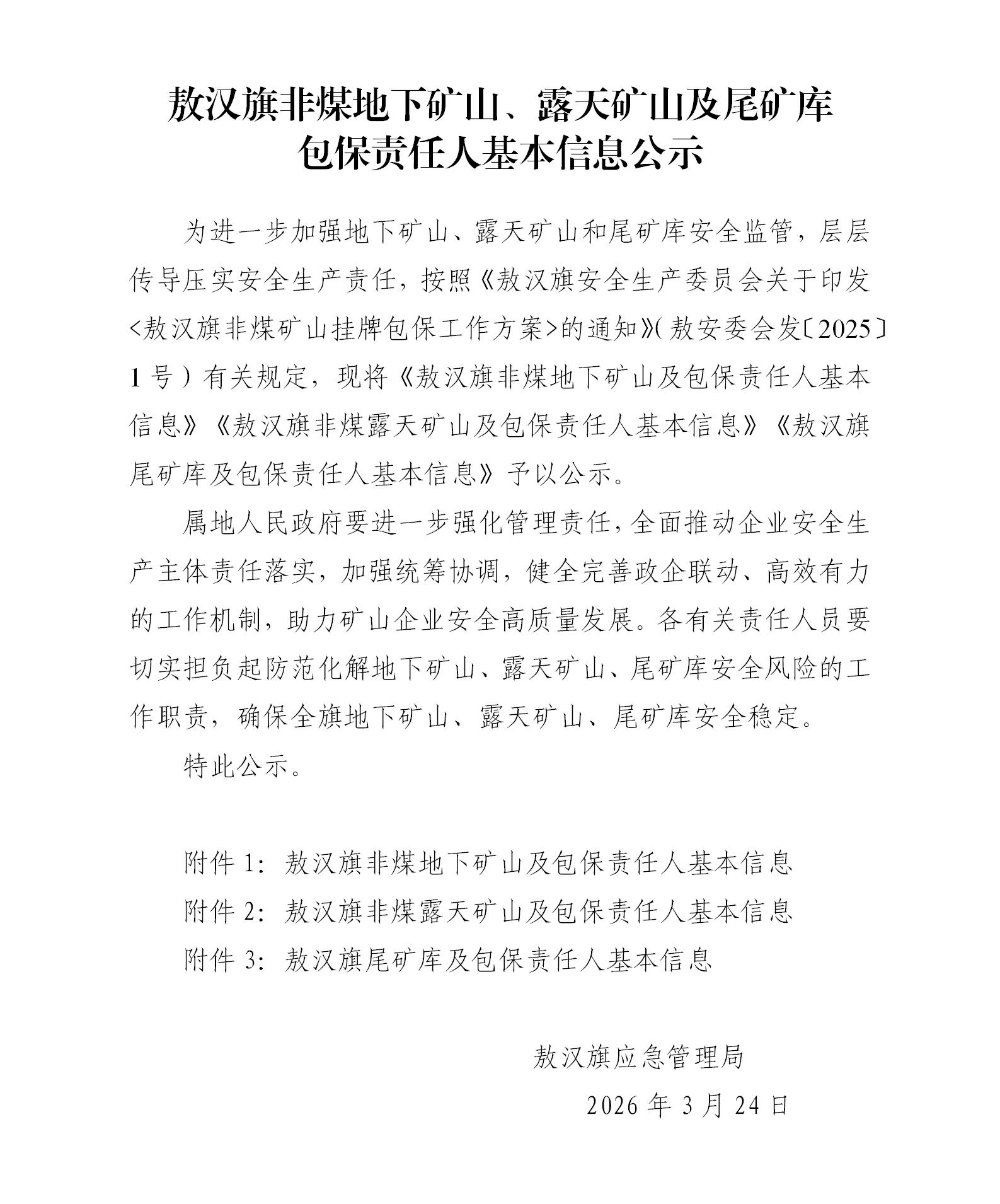 敖汉旗非煤地下矿山、露天矿山及尾矿库包保责任人基本信息公示