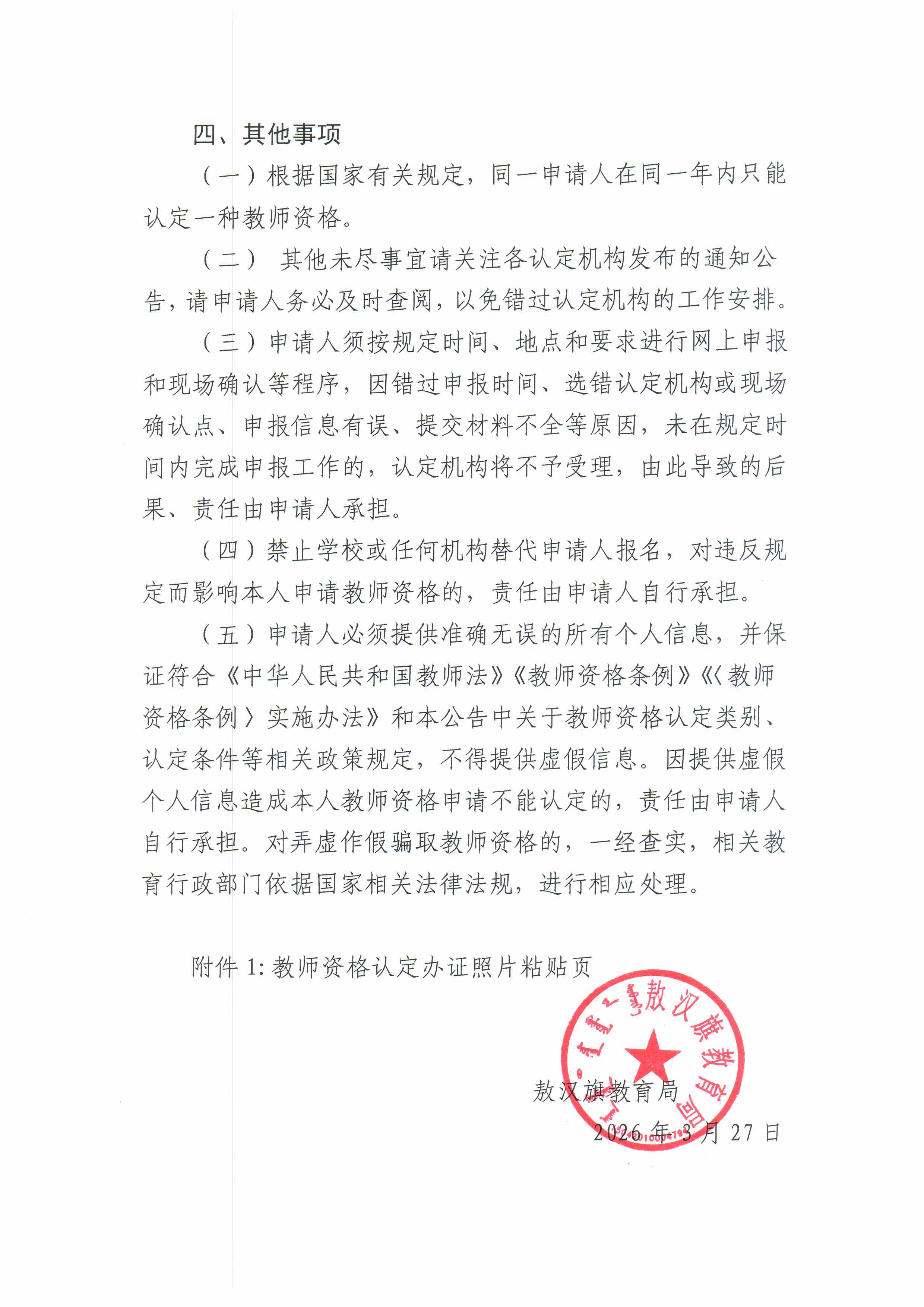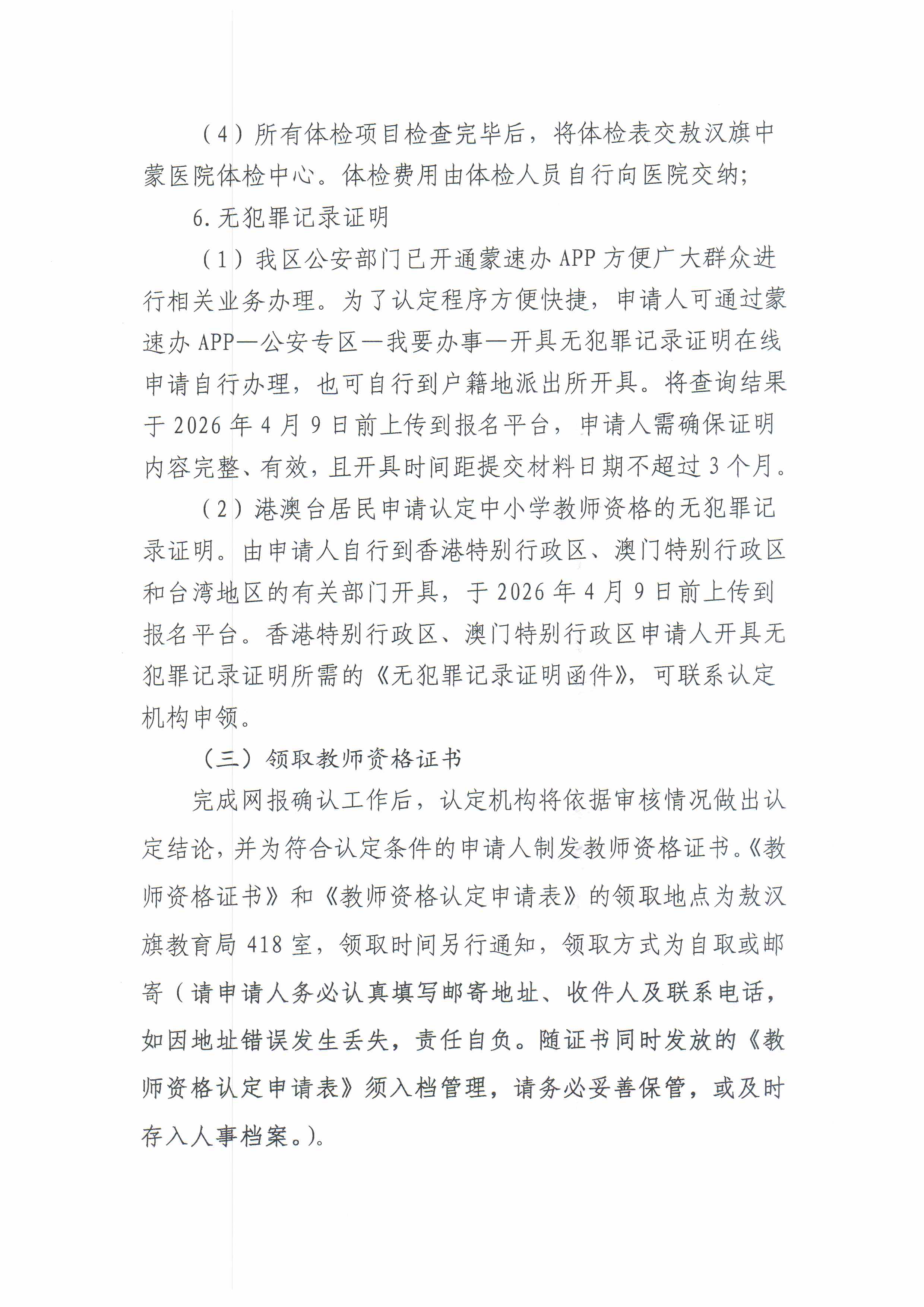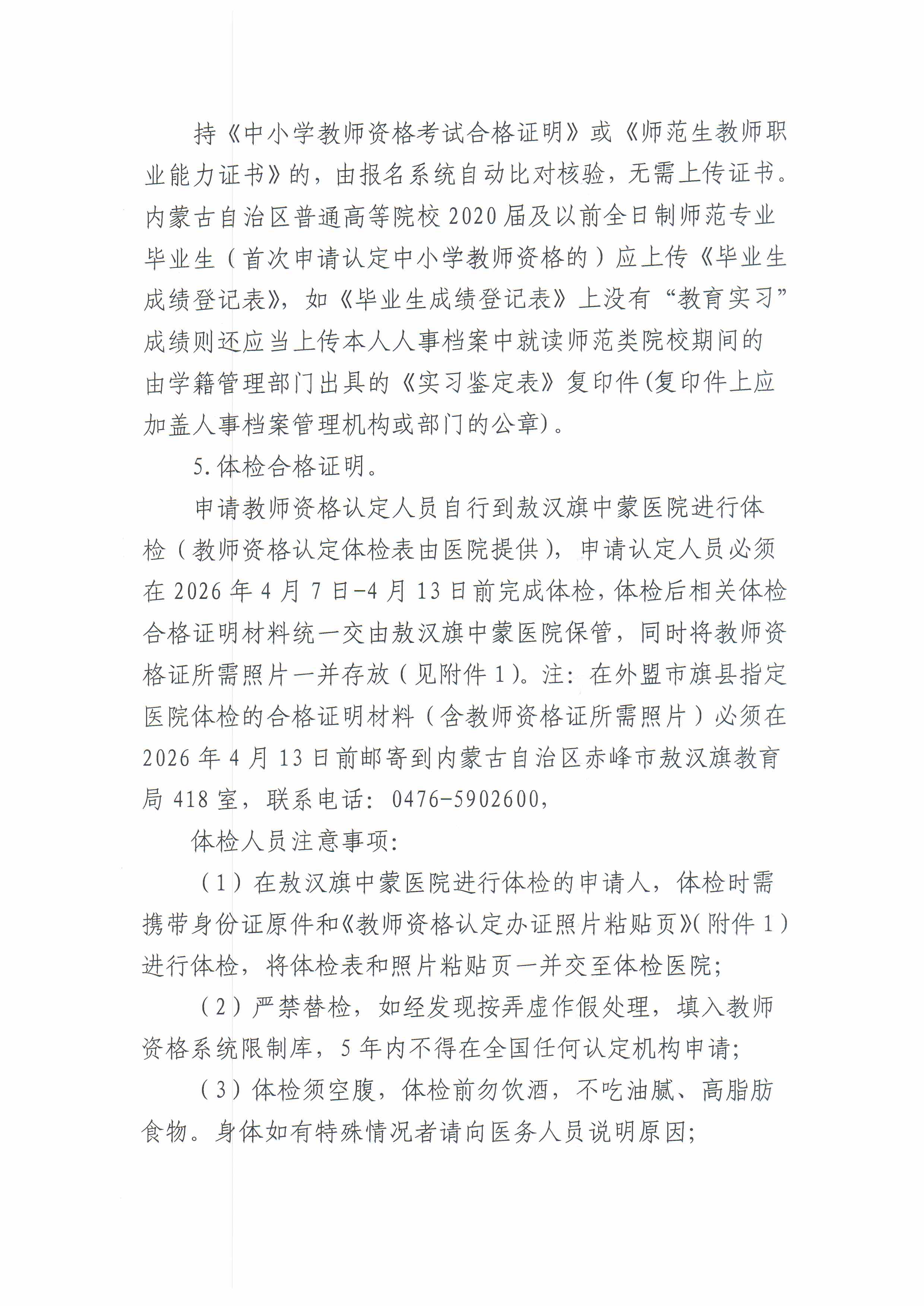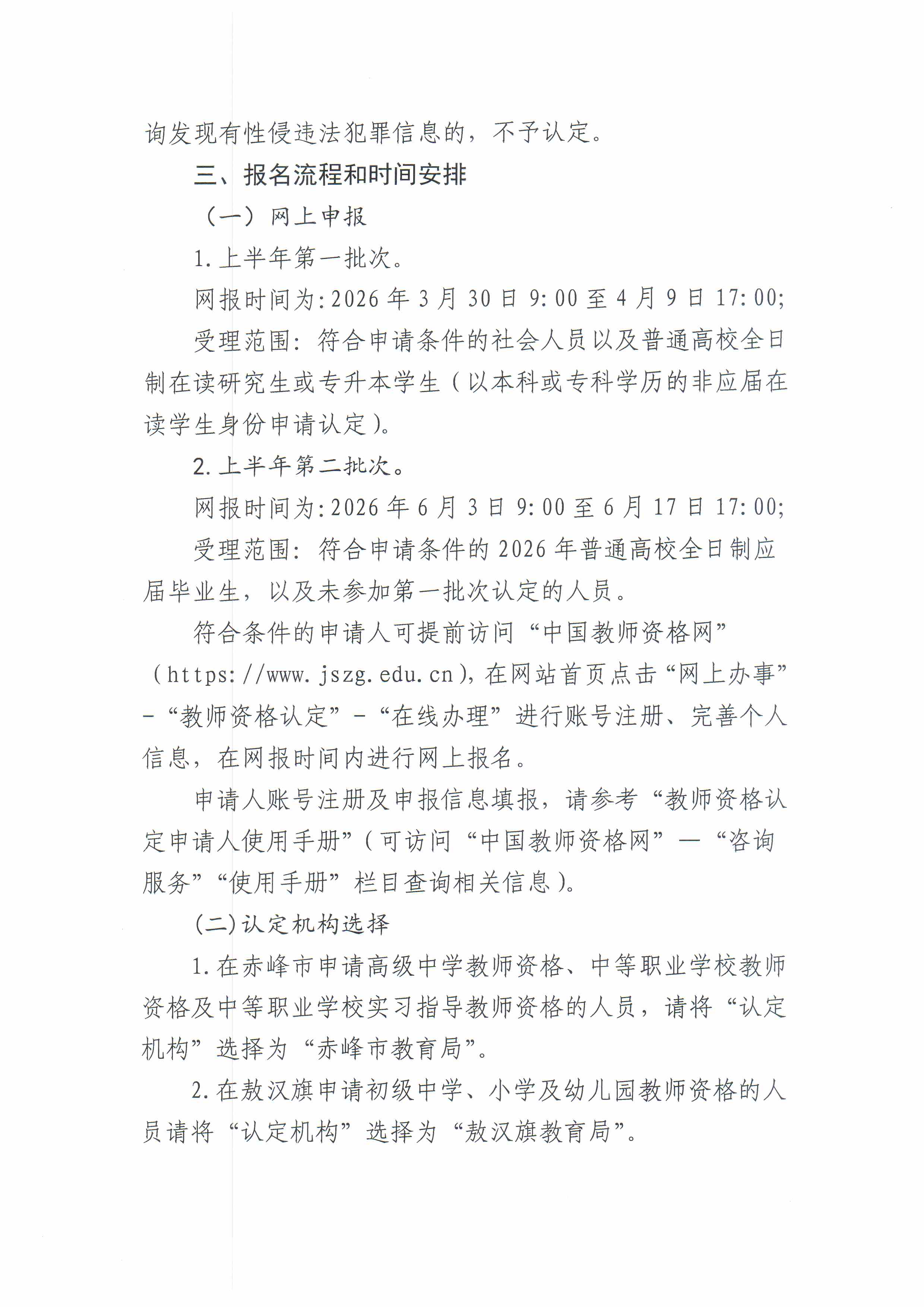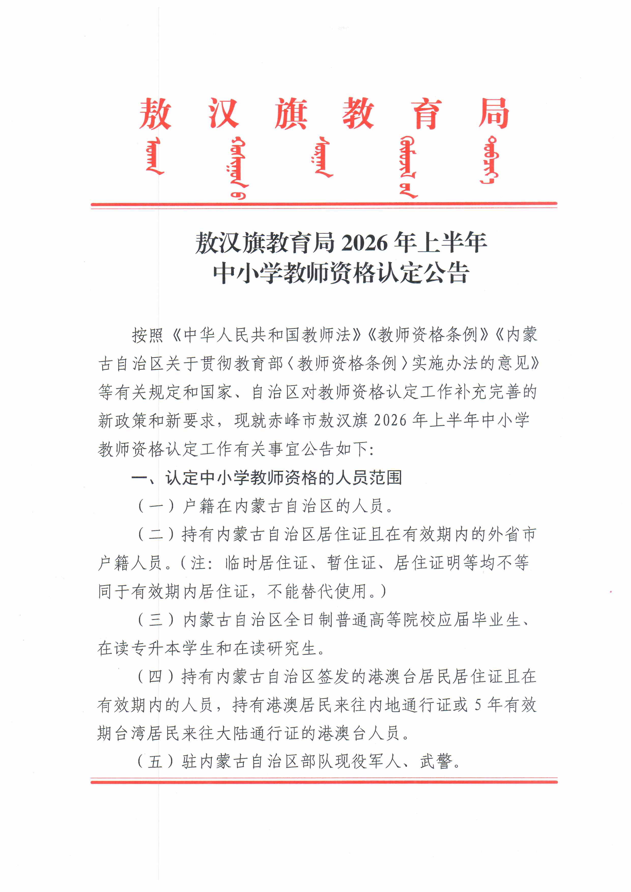 敖汉旗教育局2026年上半年中小学教师资格认定公告