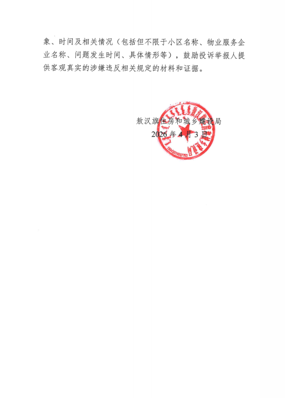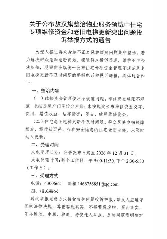 关于公布敖汉旗整治物业服务领域中住宅专项维修资金和老旧电梯更新突出问题投诉举报方式的通告