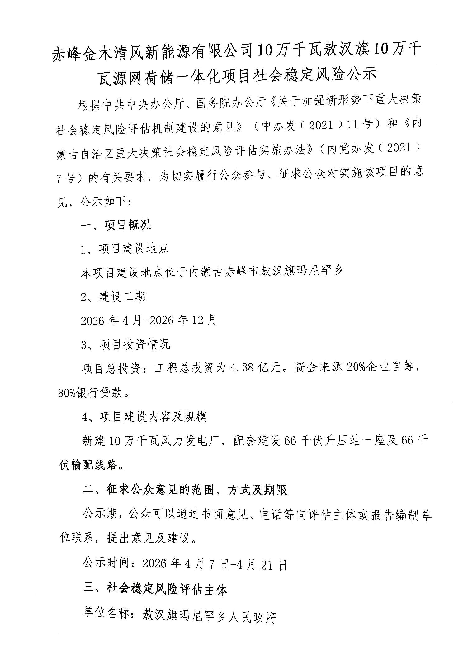 赤峰金木清风新能源有限公司10万千瓦敖汉旗10万千瓦源网荷储一体化项目社会稳定风险公示