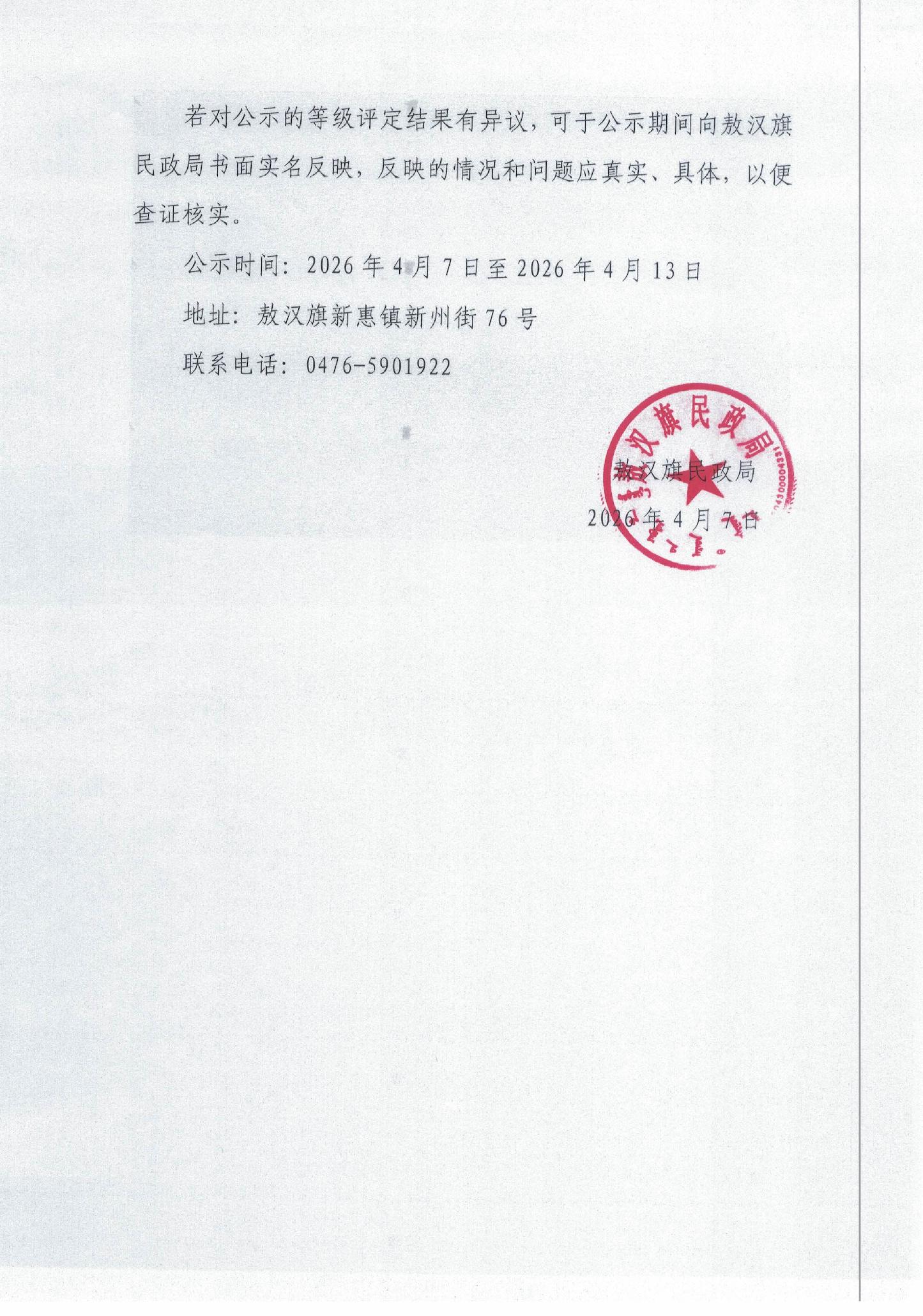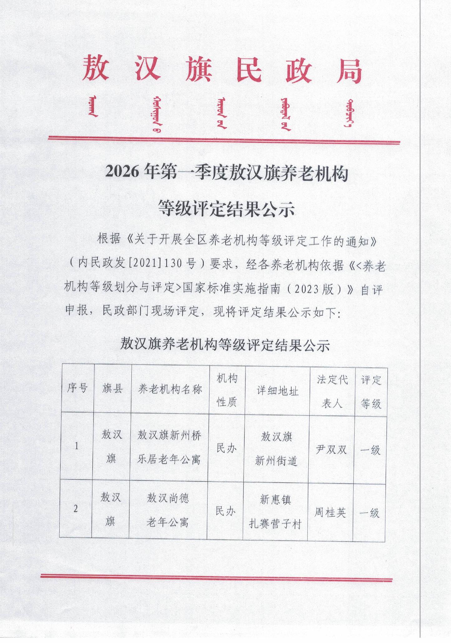 2026年第一季度敖汉旗养老机构等级评定结果公示