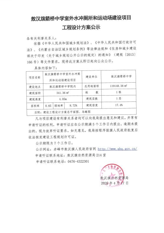 关于敖汉旗箭桥中学室外水冲厕所和运动场建设项目工程设计方案公示
