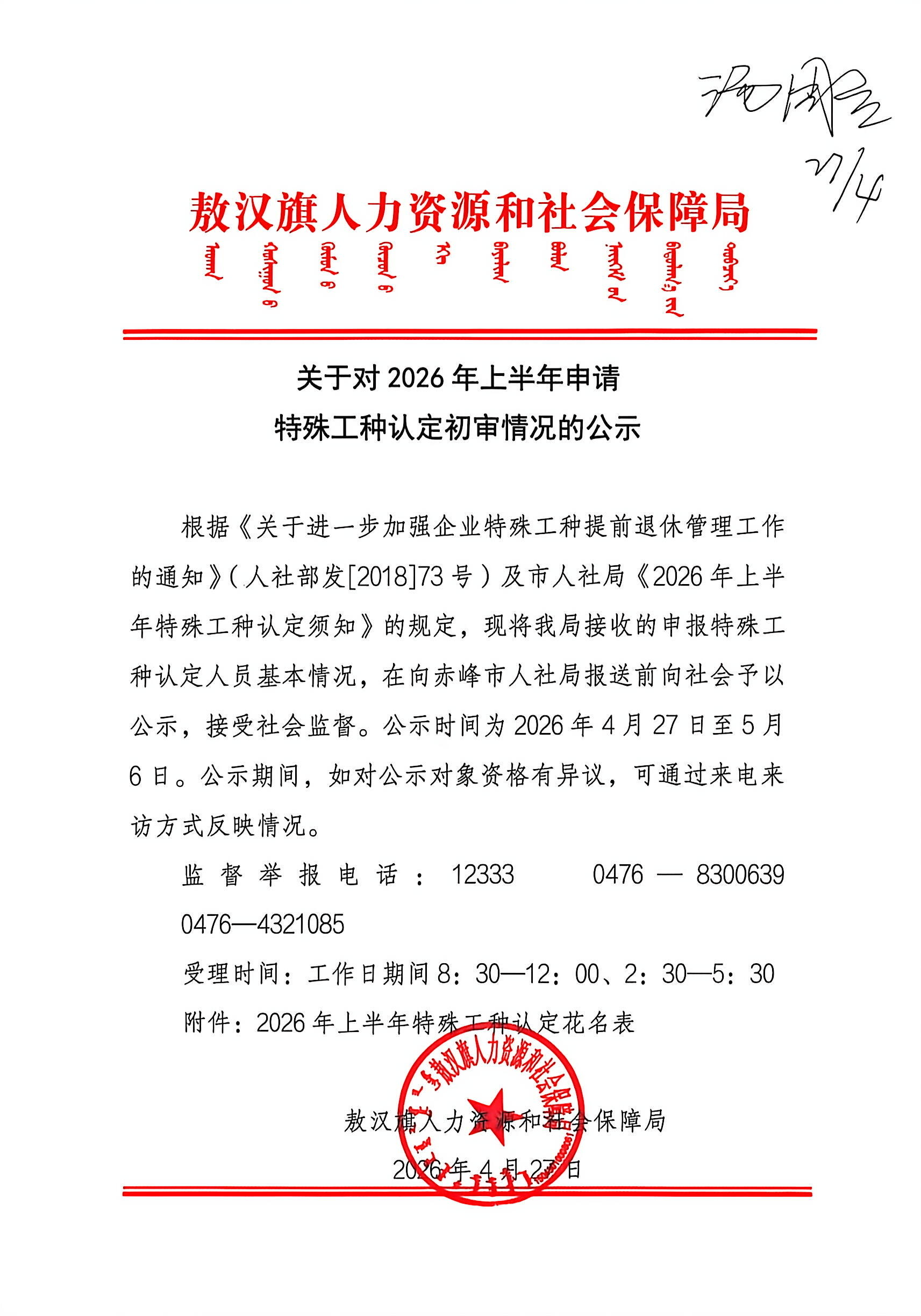 关于对2026年上半年申请特殊工种认定初审情况的公示