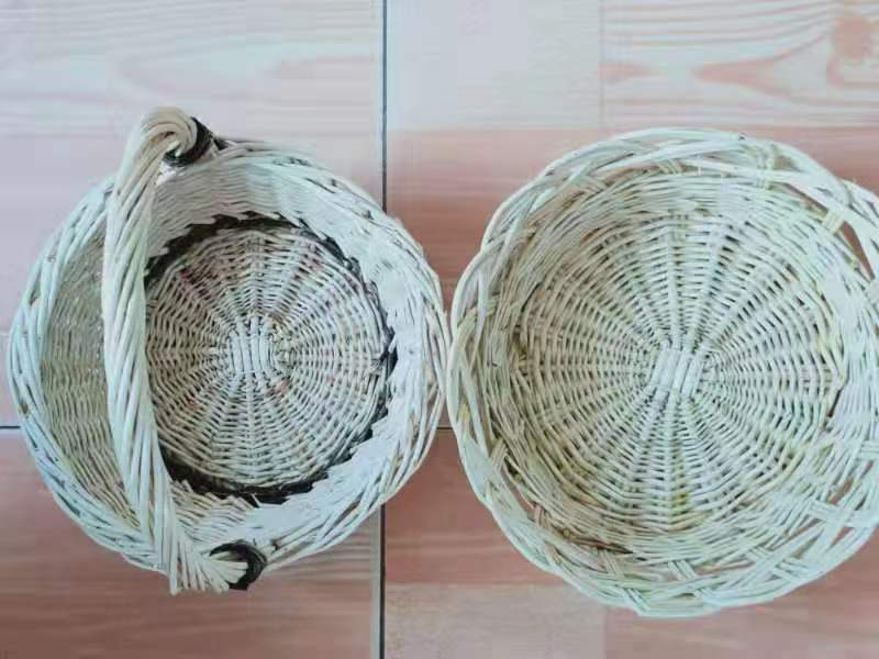 张俊华所说的“筐”,俗称“土篮子”,土篮子是农家院最常见、用途最大的柳条筐。柳条筐采用纯手工编织而成,造型多样,轻巧方便,结实耐用。根据用途可以分为装苞米的土篮子、抱柴火的片筐、摘豆角的长条筐、装鸡蛋的细条筐等等。“虽然都是柳条筐,由于选用柳条的种类、粗细,甚至时节不同,编出来的也千差万别。”俗话说万事开头难,编柳条筐更是如此。要先将困好的柳条按照长短粗细分成几堆,挑选十六根均匀的长柳条,四根一组梢朝外根朝里相对摆放,四组柳条分层摆放成米字形,用细绳固定好。再选取三根较细的柳条,并拢在一起,三根细条留头稍多一些,在米字形上按照一上一下、一压一挑的方式编织一圈,然后从外向内依次穿过留头,用力向米字形中心拉三根细条,靠近米字形中心位置上又被细条盘了一圈,形成一个八道径的小圆盘,最后用镰刀或剪子除去柳条多余的部分,土篮子打底才算成功。编底时,要把圆盘翻过来扣到地上,挑选较短柳条,通常按照顺时针方向,将柳条按照一压一挑方式依次越过每道径,这样的“八卦”造型,既形似蜘蛛网,又神似厨房里捞小米饭的铁丝笊篱。每编完一圈时,就要插径,使原来每股两根柳条变成每股四根,同时还要根据土篮梁尺寸大小,在适当时候进行分径,就是把每道径一分为二,由最初的八道径变成十六道径(有时还要看柳条筐的大小,也有的是八道径隔一分一,变成十二道径)。等到柳条筐的底面直径和土篮梁上铁丝长短差不多时,再进行插径,让每道径都有三根柳条,这时就要开始捆绑定型。定型时,要把柳条筐的底盘再次翻转过来,先数出八道径,把土篮梁立着放进去,确保下方的铁丝兜住底盘,然后依次抓起每道径的梢部,放到土篮梁的正上方,当每道径的位置与土篮梁形状能大致随下来时,用一根麻绳把柳条梢和土篮梁固定在一起扎紧,就可以进行筐身编织。“编筐编篓,重在收口”。土篮子在收口前,先要进行插径,一定要确保起始的两道径上至少有六根柳条,其他每道径上至少有四根柳条。柳条筐收口手劲儿掌握上大有玄机:手劲太大,柳条破裂,露出白茬,大打折扣;手劲太小,会歪歪扭扭,松松垮垮,美感尽失。收口时,一般先拧第一道径的前四根枝条,顺时针拧成一股带劲儿的柳条绳儿,向右侧沿着筐身边缘,在第一道径和第二道径之间压实压紧,末端放到筐身内部顺势盘好。再将第一道径剩余的两根枝条,与刚才盘到筐内的柳条绳中两根较壮的枝条重新组合,按照上述方法,再把第二根柳条绳盘到第二道径中间,两道柳条绳拧成了麻花劲儿。如此反复,拧成的圆形麻花劲儿顺着筐身边缘盘旋一圈。当最后一根柳条绳儿回到起始位置时,用手指粗的木锥在筐身第一道径位置钻出一个圆孔,让柳条绳儿由外向内穿过固定即可。据说有人为了美观,在收口时居然还拧出了三股麻花劲儿。
