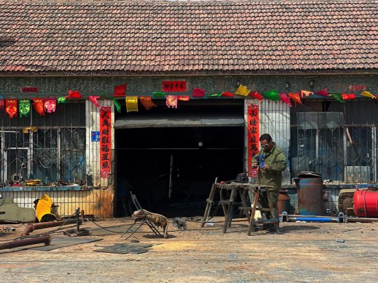 这是一间建在村“中心”的打铁铺,在几间卷帘门铺面的遮挡下显得毫不起眼,没有门面,连块招牌也没有,但铁砧、铁炉、锤子、火钳、砂轮机等打铁工具一应俱全,不停运转的风炉和敲打声,似乎在告诉路人,这里仍保留着传统的打铁技艺。