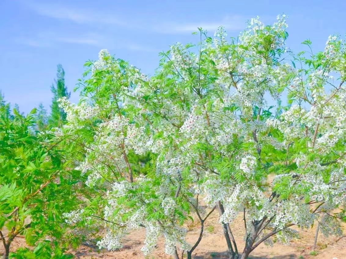文冠花开现芬芳,绿色发展势头强。走进黄羊洼镇文冠果种植基地,一朵朵文冠果花迎风绽放、芳香袭人,各色花朵荡漾成一片令人心旷神怡的文冠花海。文冠果,古称长寿果,《本草纲目》记载:神农尝百草,中毒得文冠果解之,久服百病不侵,延年益寿。黄羊洼镇依托内蒙古文冠庄园农业科技发展有限公司,不断引优嫁接、筛选树种、栽培繁育,打造文冠果核心栽植区5800亩,选育优良新品种8个,建立基地150亩,建造丰产林400亩,栽植优系良种选育繁育和观赏绿化大苗培育示范林400亩,改造残次林种植文冠果树10万亩,辐射带动周边农户50余户,种植文冠果5000余亩。为了挖掘文冠果的综合价值,黄羊洼镇努力延伸文冠果产业链条,引进加工设备进行深加工,主要生产文冠果油、文冠果茶等,并开设文冠庄园脑健康食品体验中心,拓宽产品销售渠道,真正实现了从缤纷烂漫的“文冠花海”到硕果累累的“文冠丰收”,走出了一条生态改善和绿色发展“双赢”的道路。