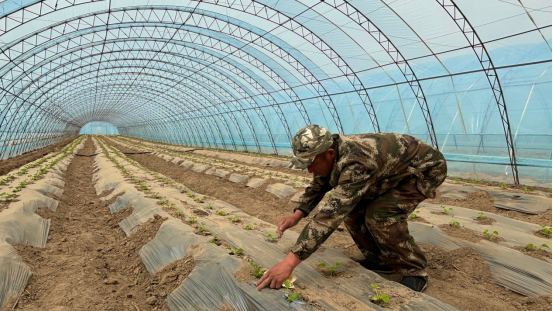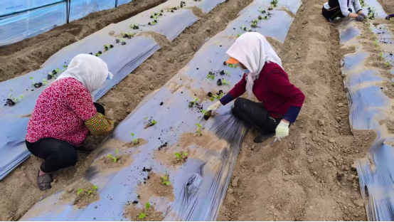 一条集技术赋能、错峰销售、就业带动于一体的“甜蜜产业链”在此落地生根。走进大棚,20余名工人默契协作,左手轻握瓜苗、右手快速培土,汗珠滚落黑土间,勾勒出一幅热火朝天的春耕图景。
