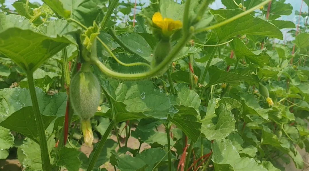 “这片棚区是第一批定植的,品种为芳华美美1号,6月初开始授粉,目前果实已长有鸡蛋大小,预计7月底左右这批瓜就能上市了。”园区负责人吴迪介绍说。