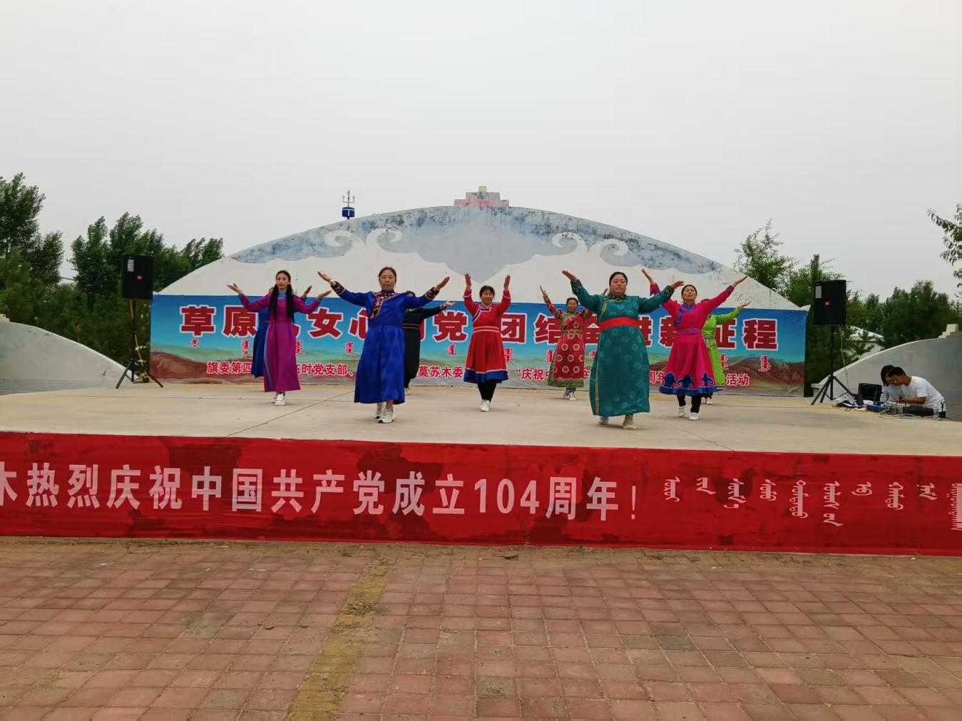 文艺汇演,凝聚团结力量。敖润苏莫苏木中心小学学生代表以灵动活泼、蓬勃朝气的开场舞《我们一起快乐跳舞》,点燃现场氛围。随后,各嘎查代表献上《祝福》、《复兴大中华》、《为内蒙古喝彩》、《祖国你好》等精彩节目。最后,演出在《没有共产党就没有新中国》的大合唱中圆满结束,全体观众发齐声高歌,抒发对党的无限热爱、祖国的深情祝福和美好未来的憧憬。