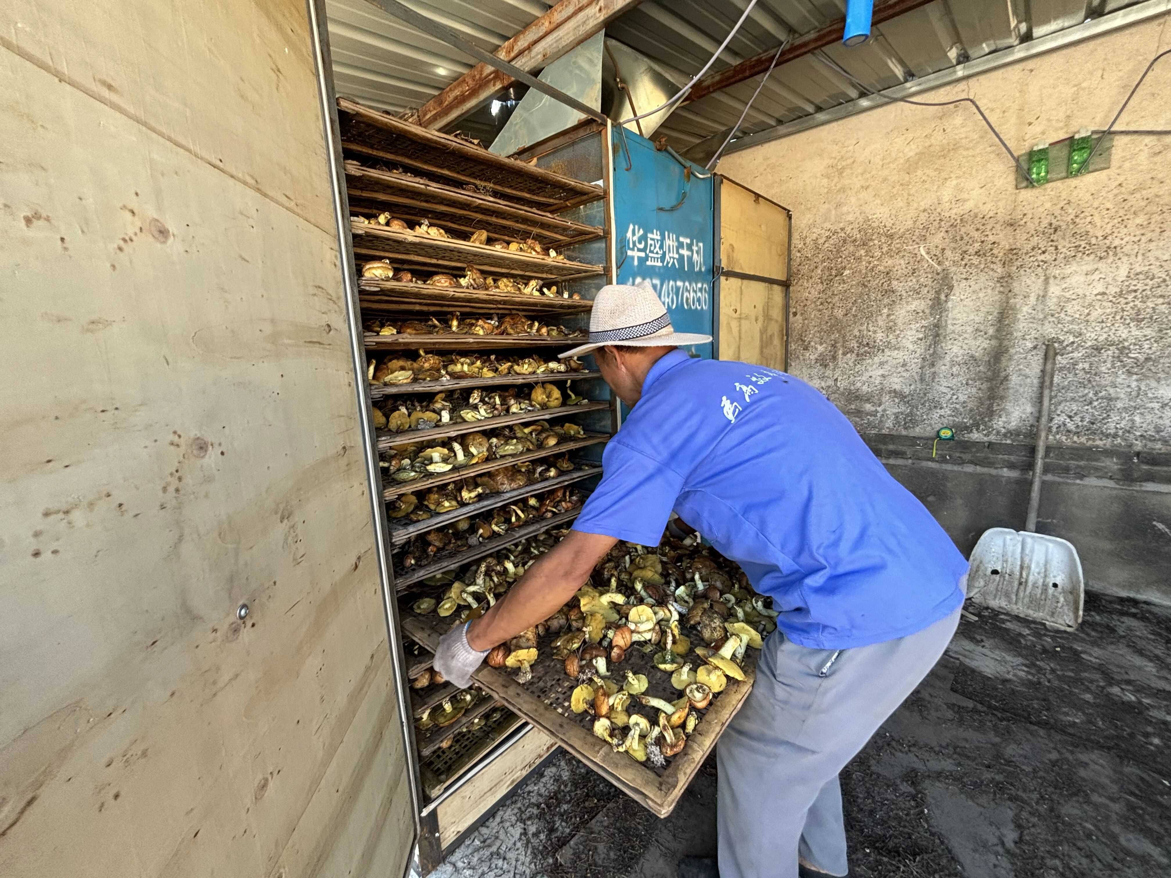 新鲜野山菌保鲜期短,若不及时处理易腐坏变质。为破解这一难题,镇上的脱水烘干厂化身“保鲜卫士”,让鲜菌“变身”干货延长价值周期。村民当天采回的鲜蘑菇,在这里能完成分拣、清洗、烘干的“一条龙”加工,不仅解决了储存和长途运输难题,更让蘑菇附加值大幅提升。目前,全镇已配备蘑菇烘干机100余台,单台设备年均收益可达3.6万元。“这几天厂里机器连轴转,每天得加工4000多斤鲜蘑菇!”铁匠营子村烘干厂负责人金柱笑着介绍,厂里还雇了6名村民负责分拣包装,按天计酬,每人日薪150元,让乡亲们在家门口就能挣到稳定收入。